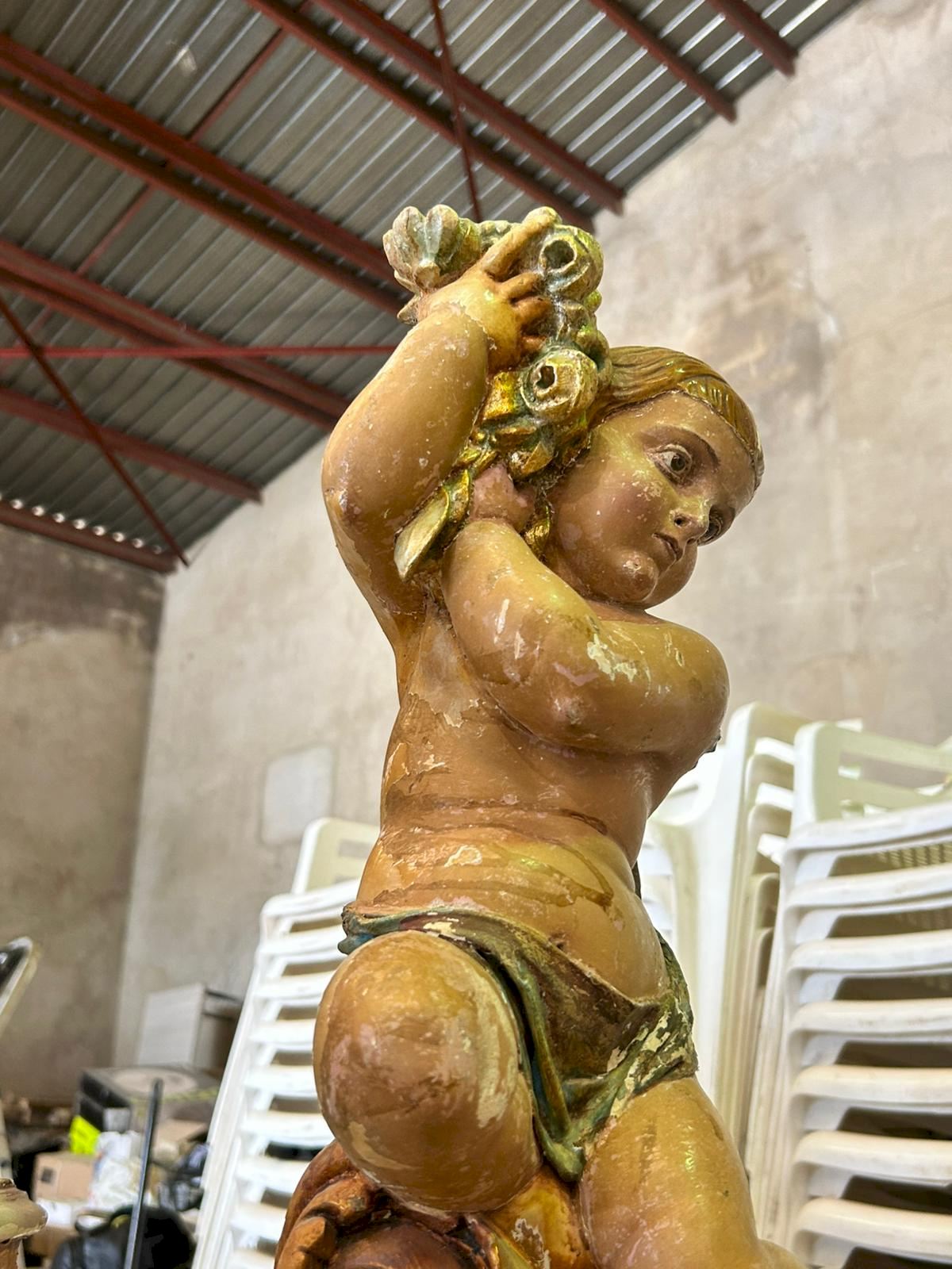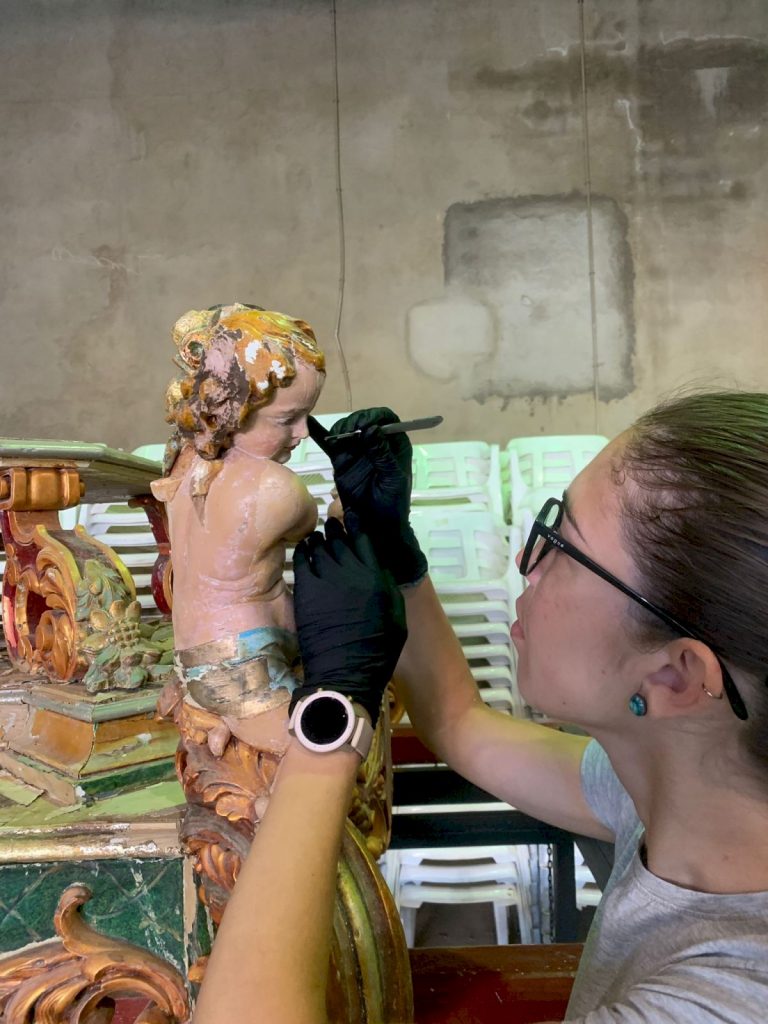 Segons expliquen les restauradores, “l’obra havia sigut repintada almenys en dues ocasions de manera tosca, ocultant la policromia original que es trobava amagada baix la pintura acrílica amb efectes metàl·lics. Aquesta capa de repintat, tot i tapar detalls exquisits, com el colorejat de les galtes, els llavis o les pupil·les dels àngels, ha actuat com a protectora i ha permés que la decoració original es mantinguera en bon estat rere les inundacions”.