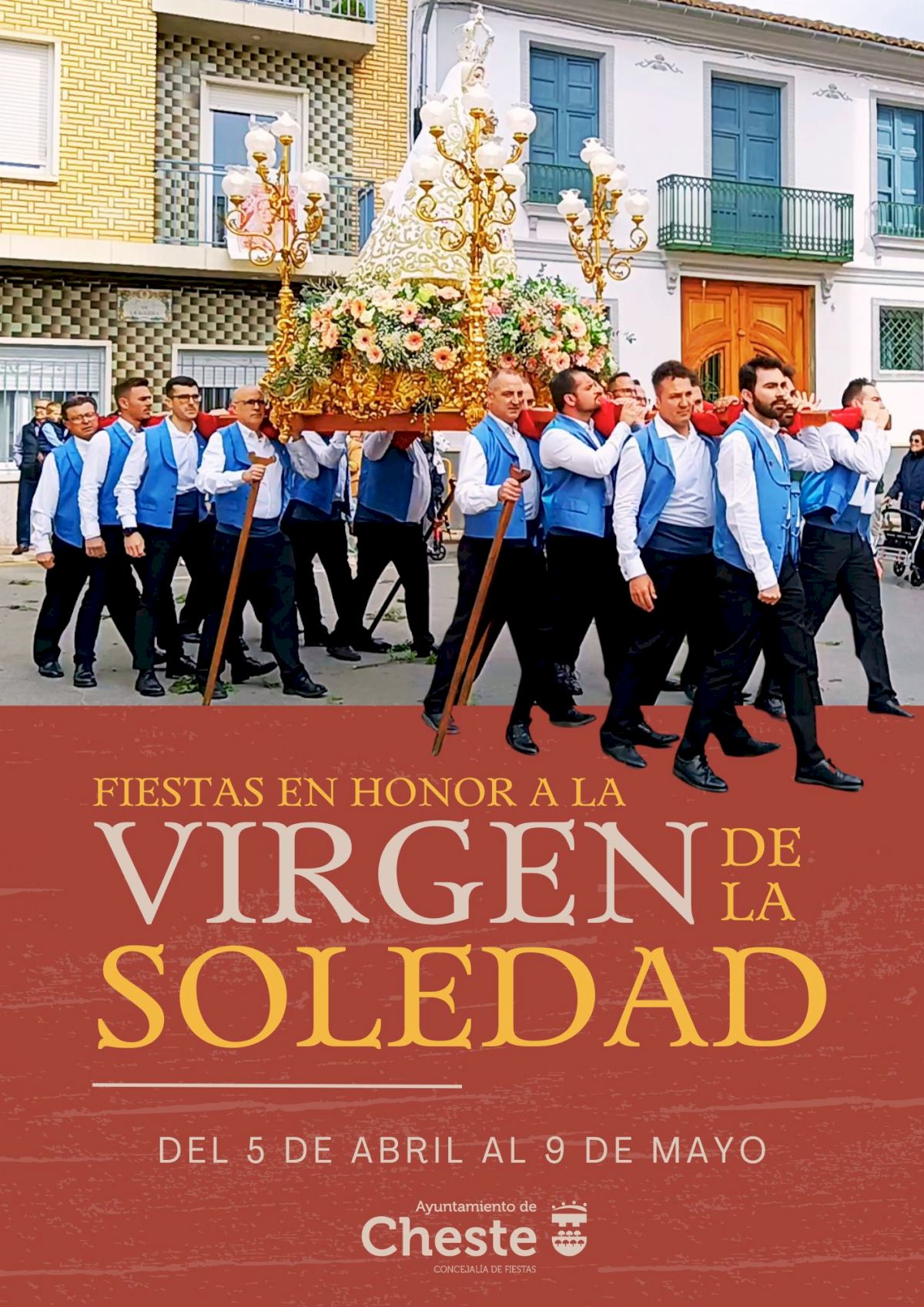 El Ayuntamiento de Cheste ha confirmado que apoyará de manera directa la celebración de las fiestas en honor a la Virgen de la Soledad Gloriosa, Patrona de Cheste, que comenzarán el próximo 5 de abril y cuyos actos culminarán el 18 de abril, además de un tardeo de los clavarios que cumplen su cincuentenario, previsto para el 9 de abril.