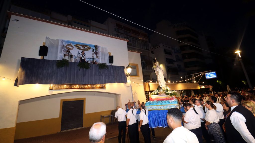 El alcalde de Benidorm, Toni Pérez, y la concejal de Fiestas, Mariló Cebreros, acompañaron a la Virgen en una comitiva formada, entre otros, por buena parte de la Corporación municipal; el diputado autonómico, Mario Villar; la Marinera de Honor 2024, Daniela Blanco Llobet; el presidente de las Fiestas del Carmen, José Vicente Pérez Pallarés; la pregonera del Carmen, Ana Llambrich López; el patrón mayor de la Cofradía de Pescadores, José Miguel Martínez; las reinas de las Festes Majors Patronals 2024, Valentina Almodóbar Climent y Laia Zamora Picó; y los presidentes de la Comissió y de la Associació de Penyes Verge del Sofratge, María Dolores Cano y Jaume Cortés.