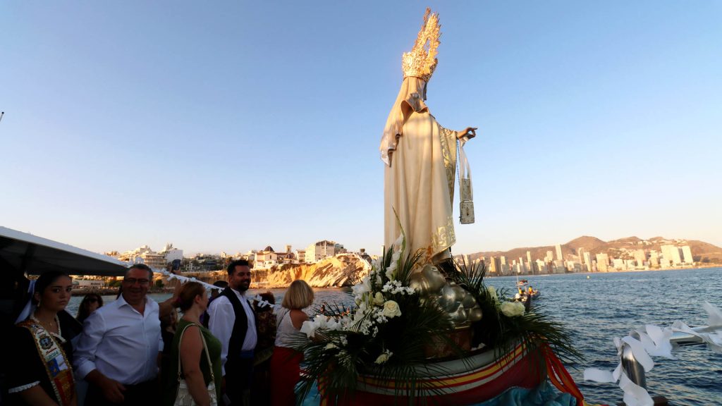 Poco antes de la puesta de sol, la nave hizo parada frente al Castell, donde un par de submarinistas se lanzaron al agua para depositar en el fondo una imagen de la Estrella de los Mares y un ramo de flores. A continuación, el sacerdote José Antonio González, dirigió la plegaria en memoria a los caídos en la mar, tras lo cual la Marinera de Honor y el alcalde de Benidorm lanzaron sendas coronas de laurel como homenaje.
