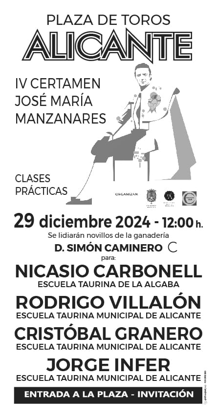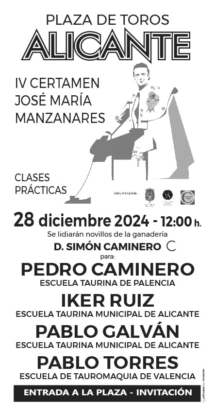 Cinco alumnos de la Escuela Taurina Municipal de Alicante -Iker Ruiz, Pablo Galván, Rodrigo Villalón, Cristóbal Granero y Jorge Infer- participarán los días 28 y 29 diciembre en las clases prácticas del ‘IV Certamen José María Manzanares’. Harán el paseíllo junto con Pedro Caminero (Palencia), Pablo Torres (Valencia), y Nicasio Carbonell (La Algaba). Lidiarán novillos, en clase práctica, de la ganadería de Simón Caminero, con un actual doble origen: Atanasio-Lisardo y Juan Pedro Domecq.
