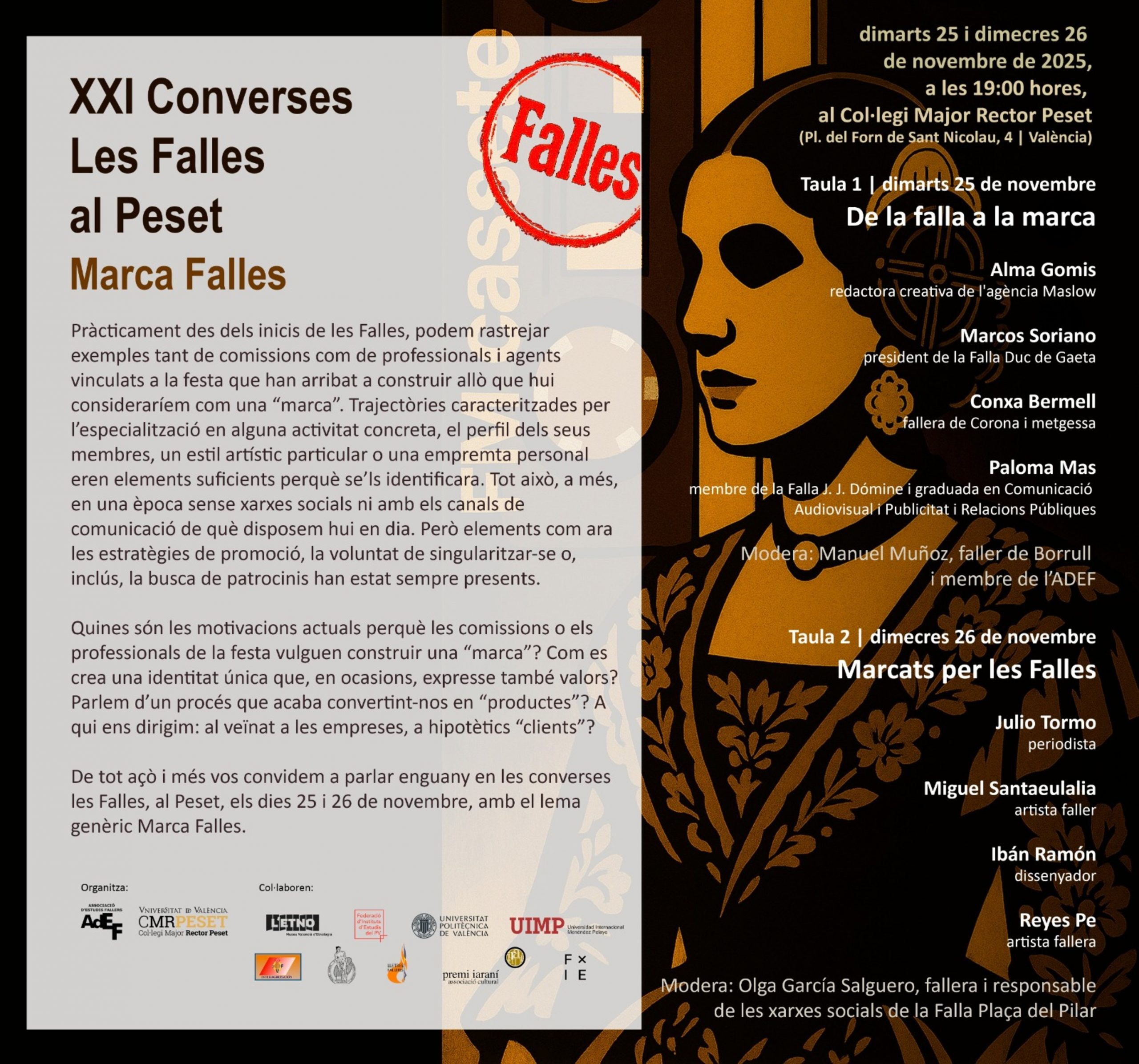 Amb el títol genèric «Marca Falles », les converses Les Falles, al Peset volen abordar enguany estes qüestions amb la participació d’experts, professionals i representants de comissions falleres en dos sessions que tindran lloc els dies 25 i 26 de novembre, a les 19.00 hores, al saló d’actes del Col·legi Major Rector Peset de la Universitat de València.