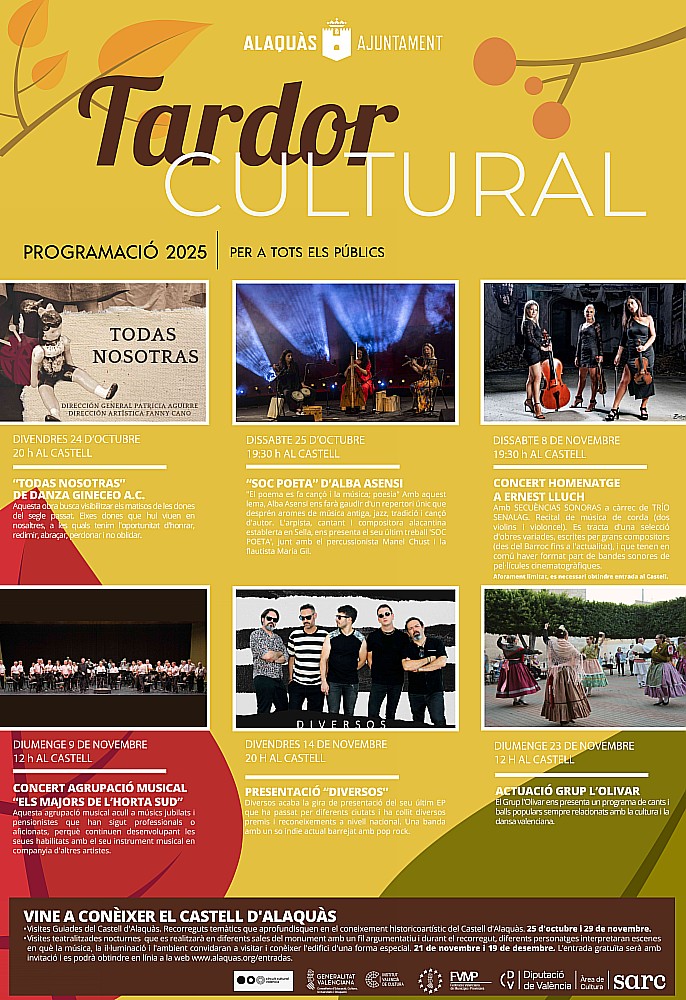 L’Ajuntament d’Alaquàs enceta demà divendres 24 d’octubre la programació cultural per als mesos d’octubre i novembre amb activitats per a tots els públics: actuacions musicals, concerts, visites guiades i dansa