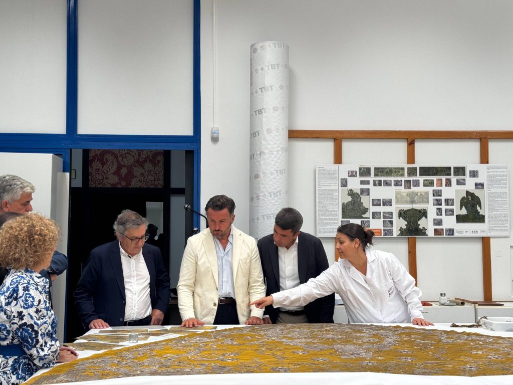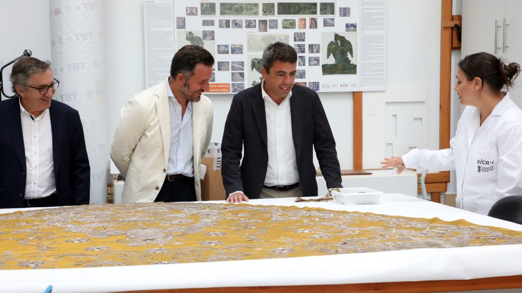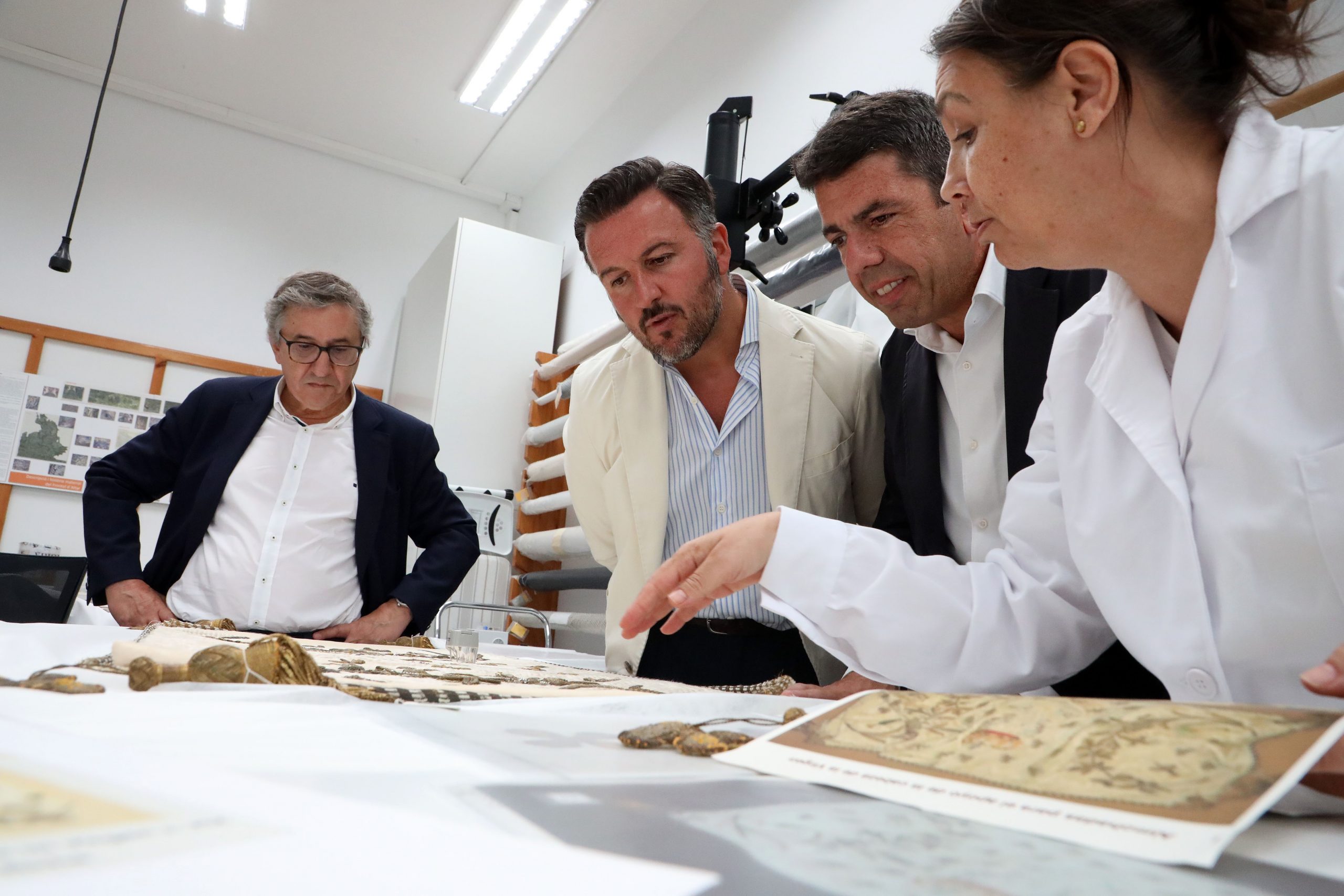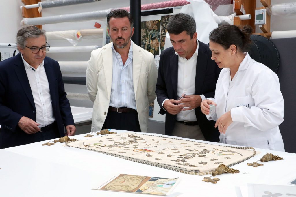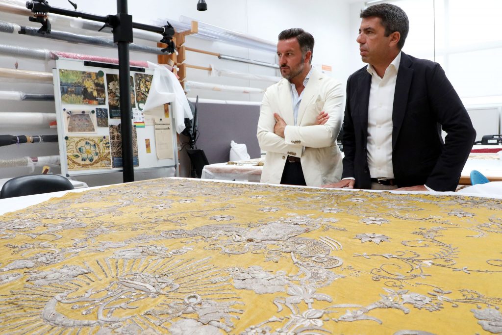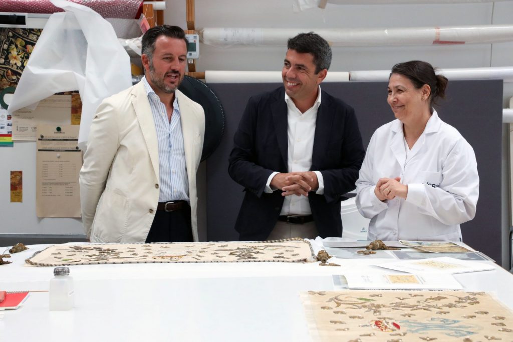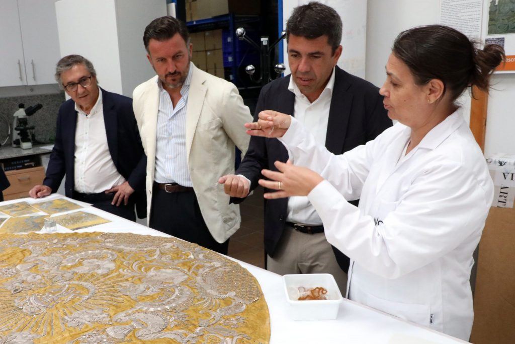 El alcalde de Elche, Pablo Ruz, junto al president de la Generalitat, Carlos Mazón, han visitado el Instituto Valenciano de Conservación y Restauración para comprobar el avance de la restauración del manto de Las Clarisas de la Mare de Déu.