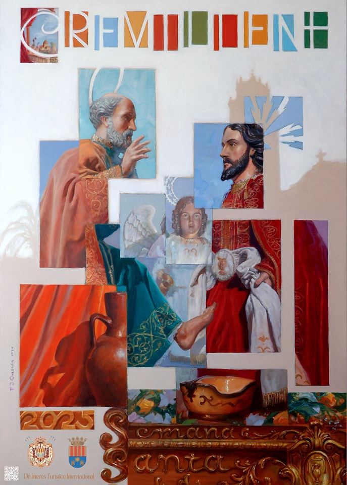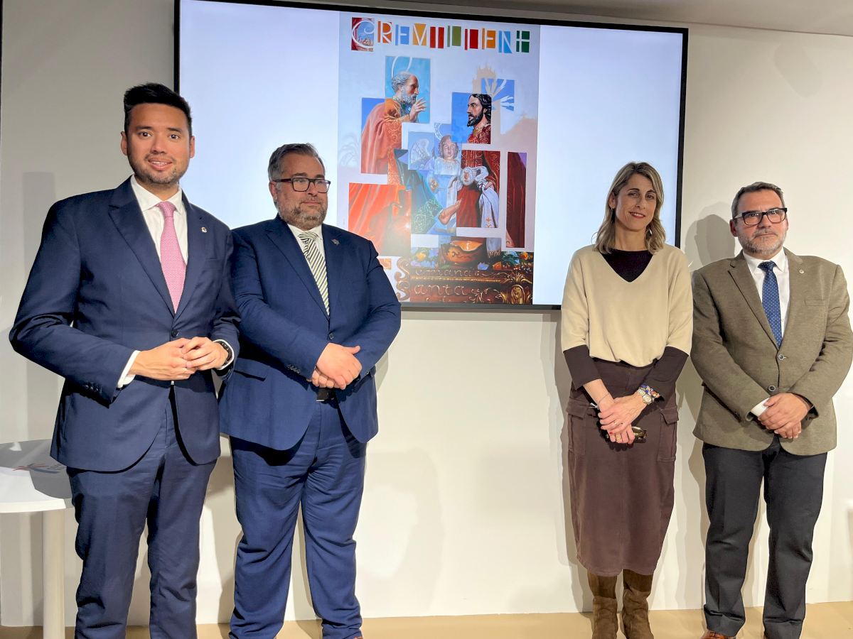 La alcaldesa ha destacado, desde el espacio habilitado por el Patronato Provincial Costa Blanca de la Diputación de Alicante, que “somos los únicos en la Comunitat Valenciana, junto con Elche, que contamos con dos fiestas declaradas de Interés Turístico Internacional”. Asimismo, se ha presentado el cartel anunciador de la Semana Santa 2025 que, al igual que se hizo el pasado año, se exhibió este cartel como reclamo turístico. “Este año el cartel es obra del pintor crevillentino Francisco Javier Quesada, licenciado en Bellas Artes por la Universidad Politécnica de Valencia, y muy reconocido en nuestra localidad, y se representa, de una forma modernista, a través de un óleo sobre lienzo, el grupo escultórico de la Cofradía de El Lavatorio”, ha analizado la primera edil, quien ha añadido que “esta composición crea un juego de espejos, haciendo alusión al popular nombre del “Pas dels espills” e incorporando también elementos distintivos como la Iglesia de Nuestra Señora de Belén y la primera portada de la revista de Semana Santa de 1925, que, por cierto, esta publicación cumple en este año su centenario”.