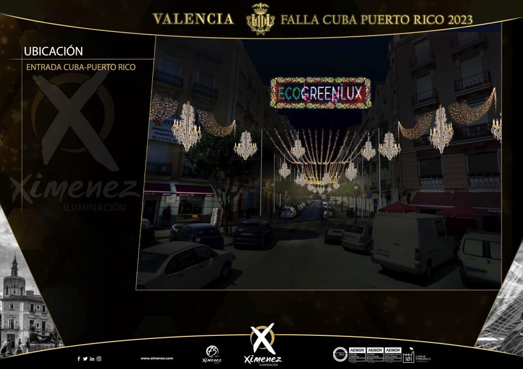 La Falla Cuba – Puerto Rico contará este año con 74 lámparas de cristal para iluminar su calle del barrio de Russafa, tal y como han publicado en la red social de Facebook. La empresa es Ximénez Iluminación y el lema «Quaranta i Llúm» que hace referencia a su número de censo, a los últimos 4 años han recibido el primer premio de iluminación de JCF y su idiosincrasia, ¡cuánta luz!.