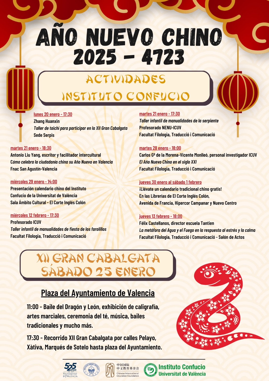 Del 20 de enero al 13 de febrero, el Instituto Confucio de la Universitat de Valencia (ICUV) ha programado y organizado una variada gama de actividades y exhibiciones culturales y festivas con motivo de la llegada del Año Nuevo Chino que, en este año 2025, corresponde al 4723 según el cómputo tradicional, año de la serpiente de madera.