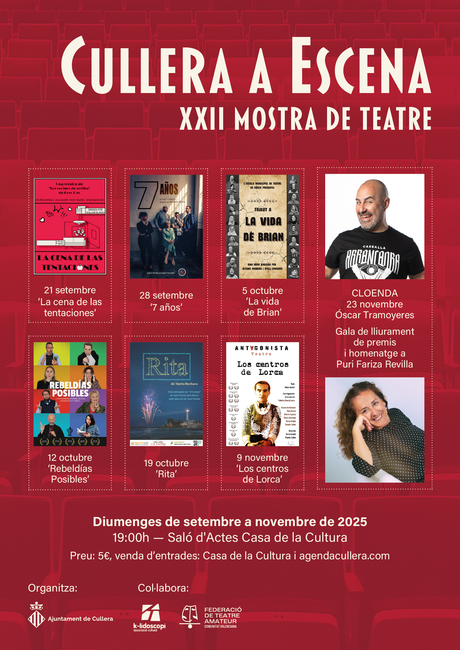 Aquesta mostra es celebra completament en el Saló d’Actes de la Casa de la Cultura, sent totes les actuacions a les 19.00 hores. Les entrades ja es poden aconseguir, a un preu de 5€, al web agendacullera.com o a la Casa de la Cultura.