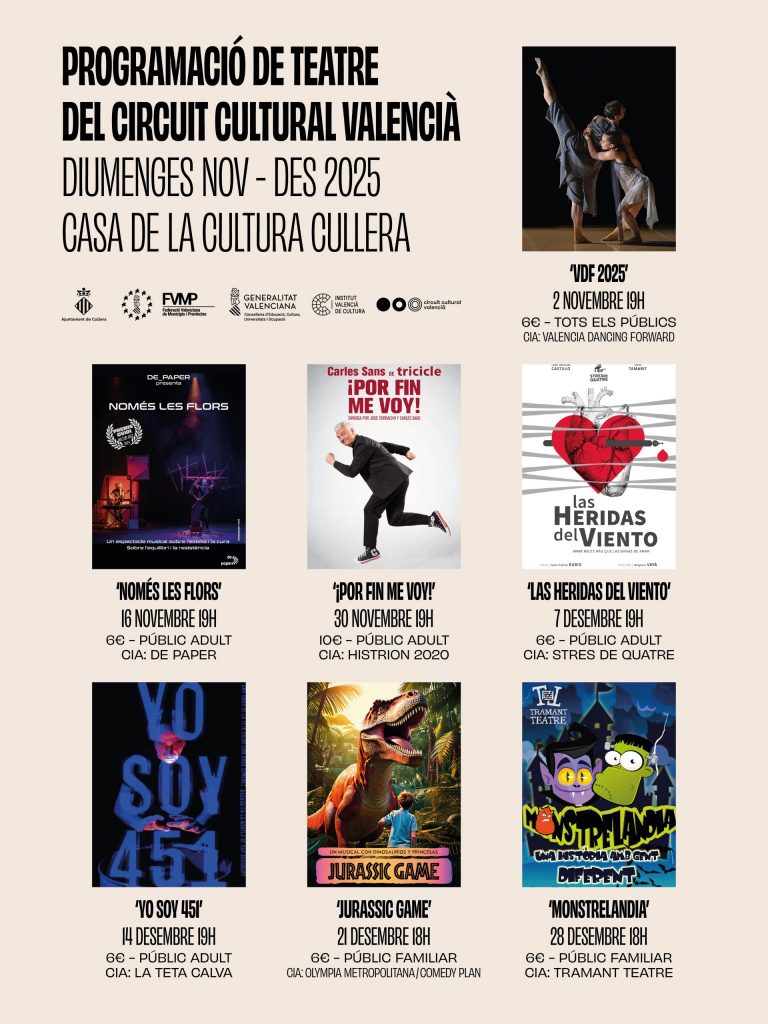Les representacions començaran el primer diumenge de novembre i finalitzaran l’últim de desembre. En el cas del mes de novembre, les obres són: el dia 2 a les 19h. “VDF 2025”, de la companyia València Dancing Forward; el 16 a les 19h., “Només les flors”, de De paper; el 30 a les 19h., “Por fin me voy”, de Histrion 2020.