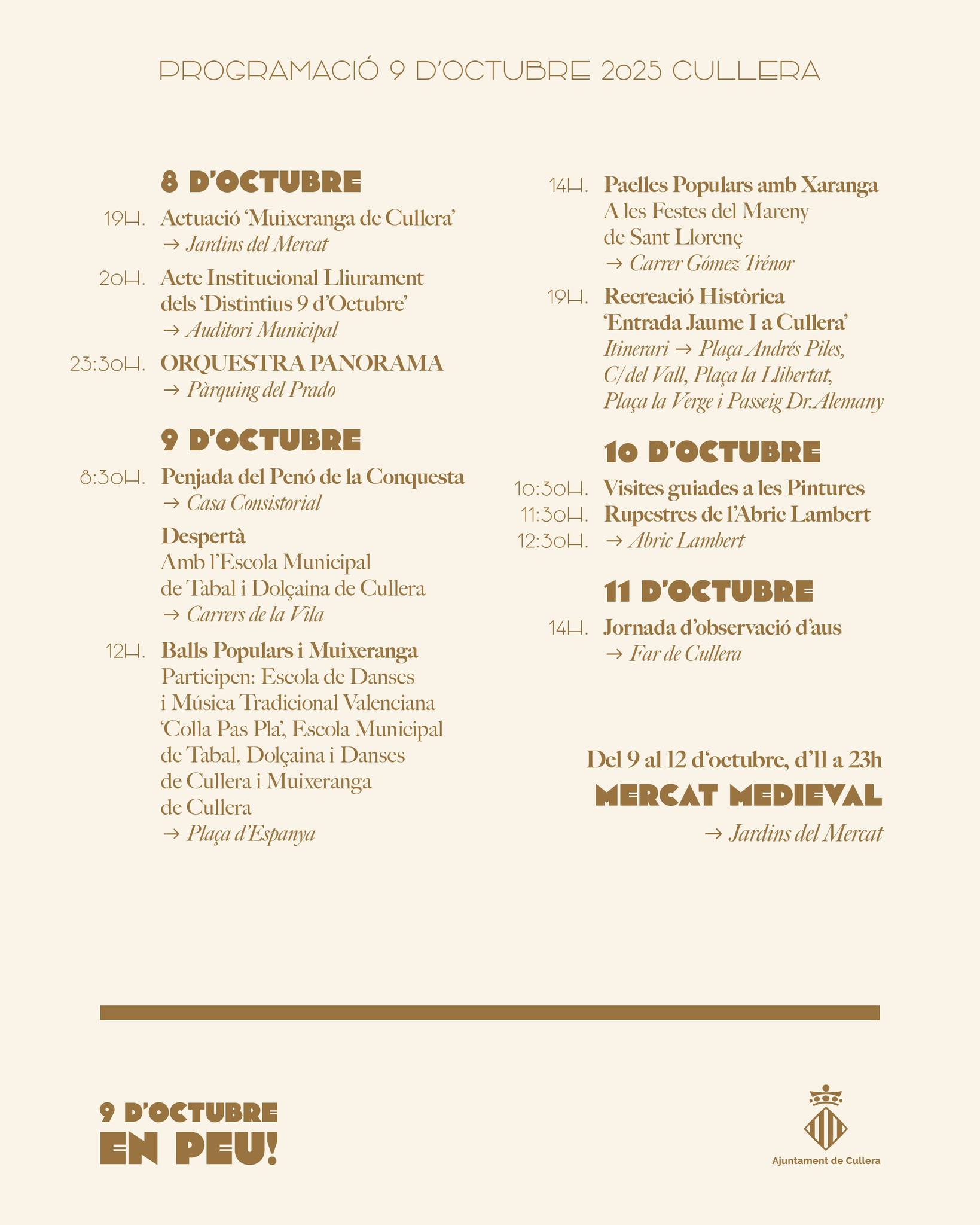 L’Ajuntament de Cullera, com és habitual, ha organitzat una programació carregada d’actes culturals i lúdics per a commemorar aquesta data. Arrancarà el 8 d’octubre amb l’acte institucional de lliurament dels ‘Distintius 9 d’Octubre’, que es desvetllaran en un ple extraordinari el proper 3 d’octubre. Ja a la nit, a partir de les 23.30h, Cullera tindrà de nou a l’Orquestra Panorama en directe al Pàrquing del Prado.