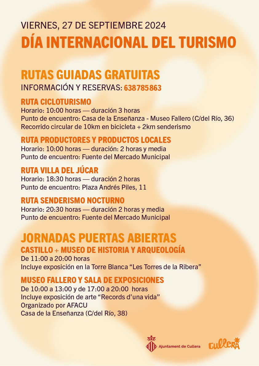 La capital turística de la Ribera ha organitzat quatre rutes guiades gratuïtes per a celebrar el dia Internacional del Turisme, que se celebra aquest divendres, 27 de setembre. Amb aquests actes Cullera se suma a la commemoració d’aquest Dia que pretén divulgar el valor sociocultural, patrimonial i econòmic del turisme a la ciutat.
