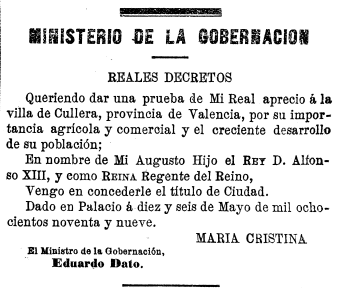 «Queriendo dar una prueba de Mi Real aprecio a la villa de Cullera, província de Valencia, por su importancia agrícola y comercial y el creciente desarrollo de su población: en nombre de Mi Augusto Hijo el Rey D.Alfonso XIII, y como Reina Regente del Reino, vengo en concederle el título de Ciudad. Dado en Palacio a diez y seis de Mayo de mil ochocientos noventa y nueve».