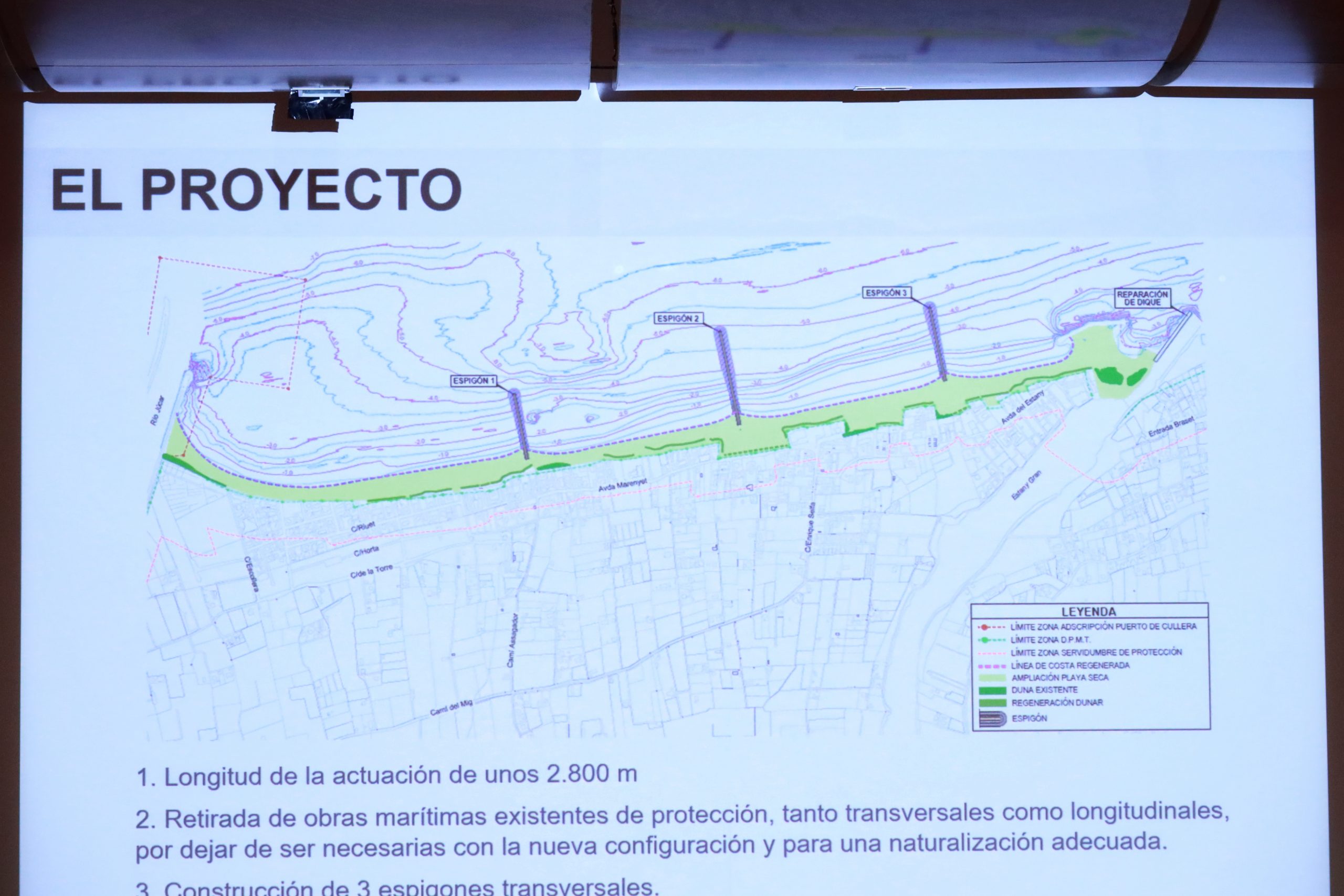 Després d’anys de reivindicacions i d’anàlisi i estudi del projecte, la Demarcació de Costes (Ministeri de Transició Ecològica) i l’alcalde de Cullera, Jordi Mayor, presentaren ahir el projecte que permetrà recuperar els arenals de quasi tres quilòmetres de costa amb una inversió de més de 18 milions d’euros per part de l’Estat.
