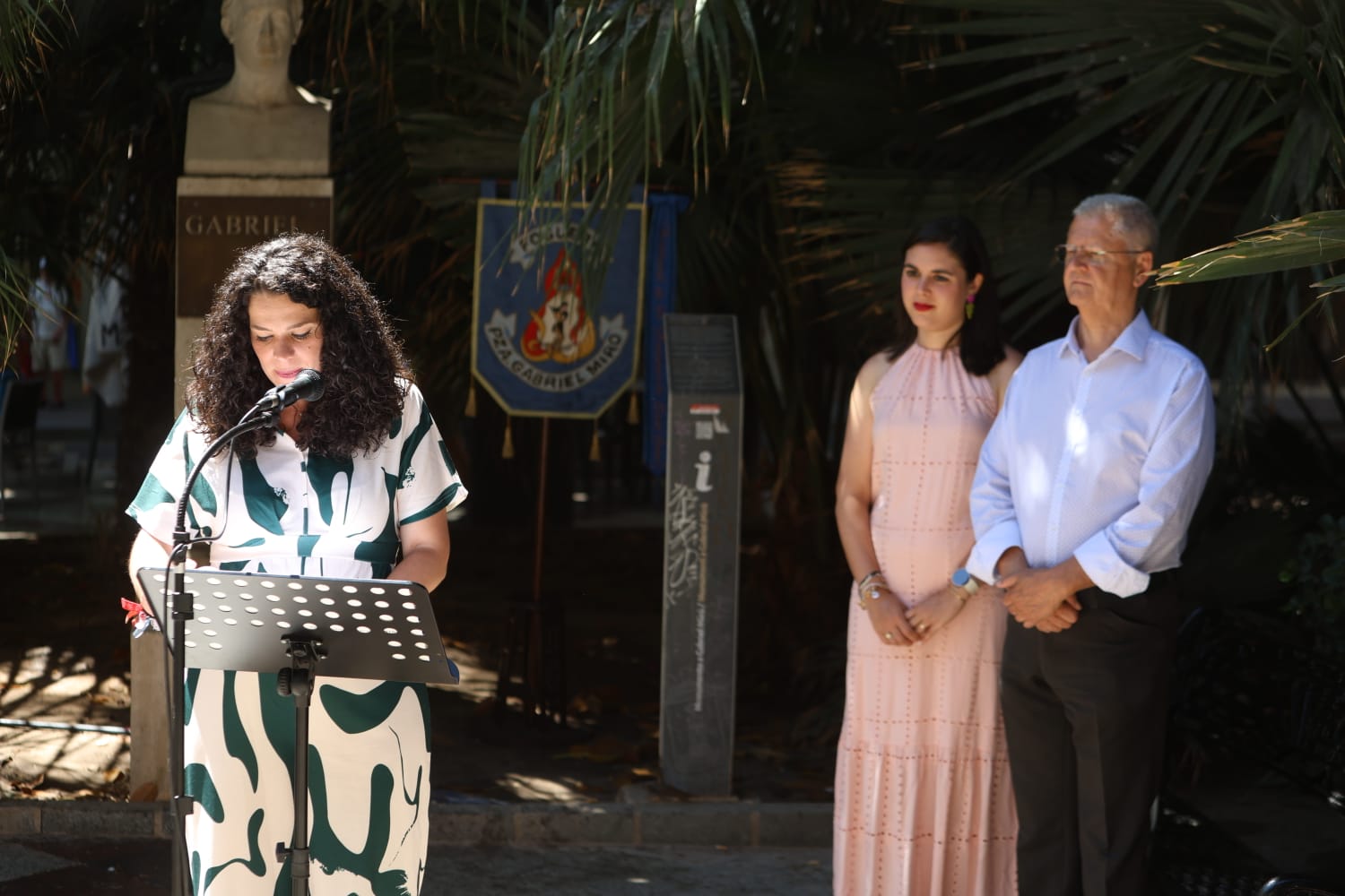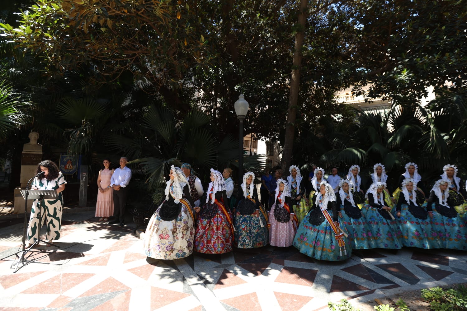 Ha recordado el pasodoble que José Ángel Guirao, uno de los «grandes presidentes» de la hoguera Gabriel Miró, dedicó a Mercedes Martínez de Mata -la única, hasta el momento, Bellesa del Foc de este distrito-. «Justo es citar a Guirao en este año en el que se cumple el 25 aniversario de su fallecimiento», ha concluido Cutanda antes de depositar una corona de laurel ante el busto de Gabriel Miró.