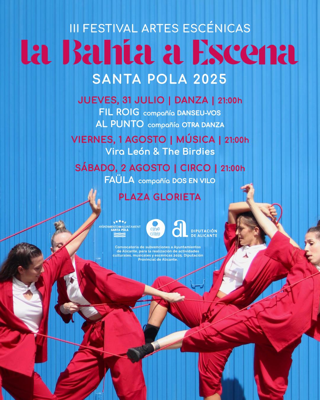 La tercera edición del Festival de Artes Escénicas “La Bahía a Escena”, con el apoyo de la Diputación de Alicante, propone tres días de espectáculos que darán vida al corazón de Santa Pola del 31 de julio al 2 de agosto.