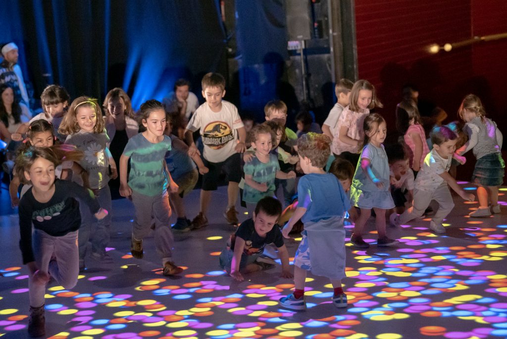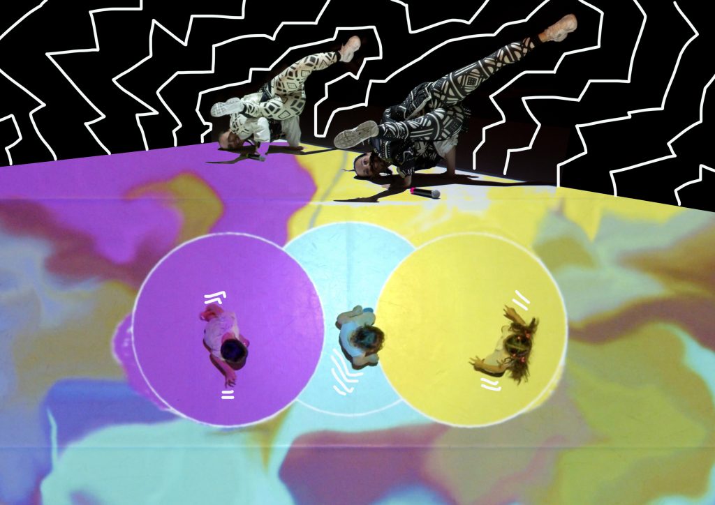 Tras este recorrido coreográfico, entra en escena un elemento tecnológico que permite a los bailarines invitar al público a participar activamente dentro de las escenas. A través del juego interactivo, niñas y niños son invitados a subir al escenario y acompañar a los personajes Hip y Hop en un viaje lleno de música, baile y juego, favoreciendo la experimentación y el aprendizaje a través del movimiento y transformando el teatro en un gran espacio de juego colectivo donde la danza se vive en primera persona.