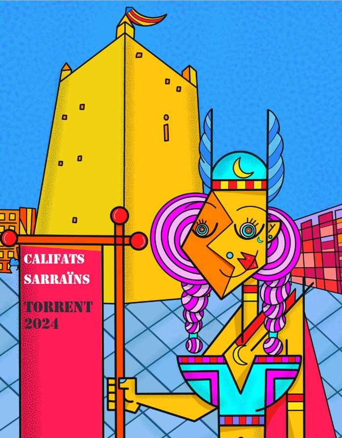 La portada diseñada para la Comparsa Mora Califats Sarraïns de Torrent es un testimonio vivo de la riqueza artística y cultural, y un tributo a la pasión y dedicación de aquellos que mantienen viva la llama de la tradición. Esta obra enlaza perfectamente con la Gran Entrada Mora, que promete ser un espectáculo de color y vistosidad, donde los colores de la portada se reflejarán en las vestimentas y decoraciones de los participantes, realzando aún más la majestuosidad del evento con Esther García Espinos al frente.