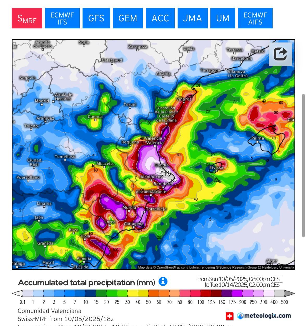 Además de la Comunitat Valenciana, las precipitaciones podrían alcanzar con intensidad a Baleares, Cataluña, Murcia, el este de Andalucía y el interior de Teruel. El viento de levante será determinante para delimitar los focos de mayor acumulación.