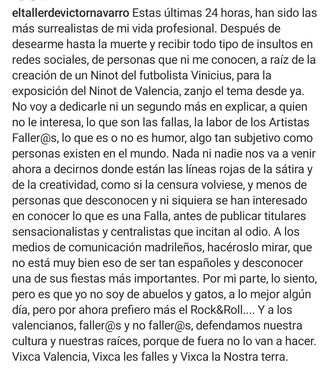 Tras la difusión de la obra, Navarro Granero, artista de Bolbaite, ha compartido en su perfil de Facebook que ha sido objeto de amenazas e insultos. En su mensaje, el artista expresó: «No voy a dedicarle ni un segundo más en explicar, a quien no le interesa lo que son las fallas, la labor de los artistas, lo que es o no es humor, algo tan subjetivo como personas existen en el mundo. Nada ni nadie no va a venir ahora a decirnos dónde están las líneas rojas de la sátira y de la creatividad, como si la censura volviese, y menos de personas que desconocen y ni siquiera se han interesado en conocer lo que es una Falla, antes de publicar titulares sensacionalistas y centralistas que incitan al odio».