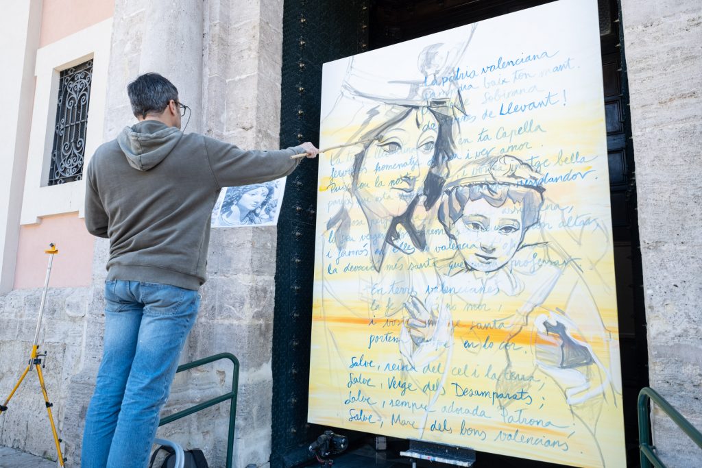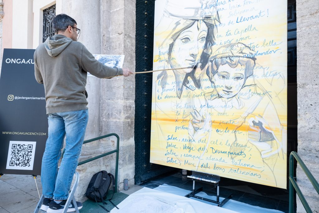 La iniciativa es de Javier García, fundador de ONGAKU, y consiste en la elaboración de un lienzo de gran tamaño, con la imagen de la Virgen de los Desamparados, por parte del artista valenciano Luis Lonjedo, durante cerca de doce horas -desde las 9 de la mañana hasta las 20:30 horas de hoy- en una de las puertas de la Basílica, a la vista del numeroso público que discurre por la plaza de la Virgen.