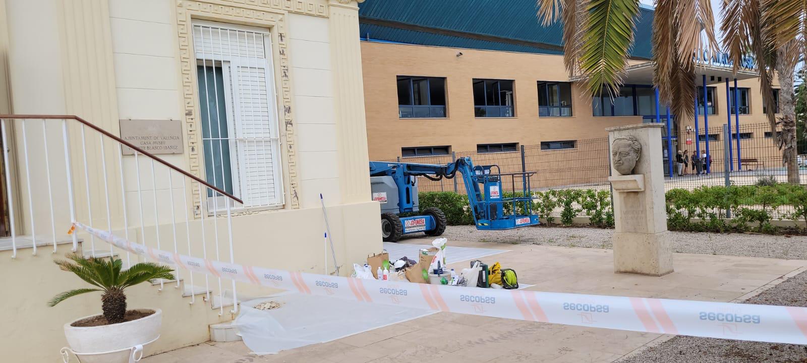 Tal como ha explicado el concejal de Acción Cultural, Patrimonio y Recursos Culturales, José Luis Moreno, “debido a su permanente exposición al sol y a la humedad y del mar, el busto en bronce de Blasco Ibáñez presentaba diferentes alteraciones”. “A pesar de que, en general, se encontraba en bastante buen estado de conservación –ha añadido- presentaba importantes zonas de cloruros de bronce que estaban afectando su estabilidad”. Además, hay que tener en cuenta que los revestimientos de las distintas fachadas de la Casa Museo y sus elementos ornamentales están realizados con mortero de cemento con un armado a base de varillas internas de hierro. Dado que el inmueble se halla en un ambiente marino, la humedad del agua penetra a través de las pequeñas fisuras existentes, lo que provoca un continuo proceso de corrosión de las varillas. Ello se transmite en presiones y empujes sobre el material de cobertura, la solubilización de los morteros, así como disgregaciones internas, con la consiguiente caída y perdida del revestimiento.