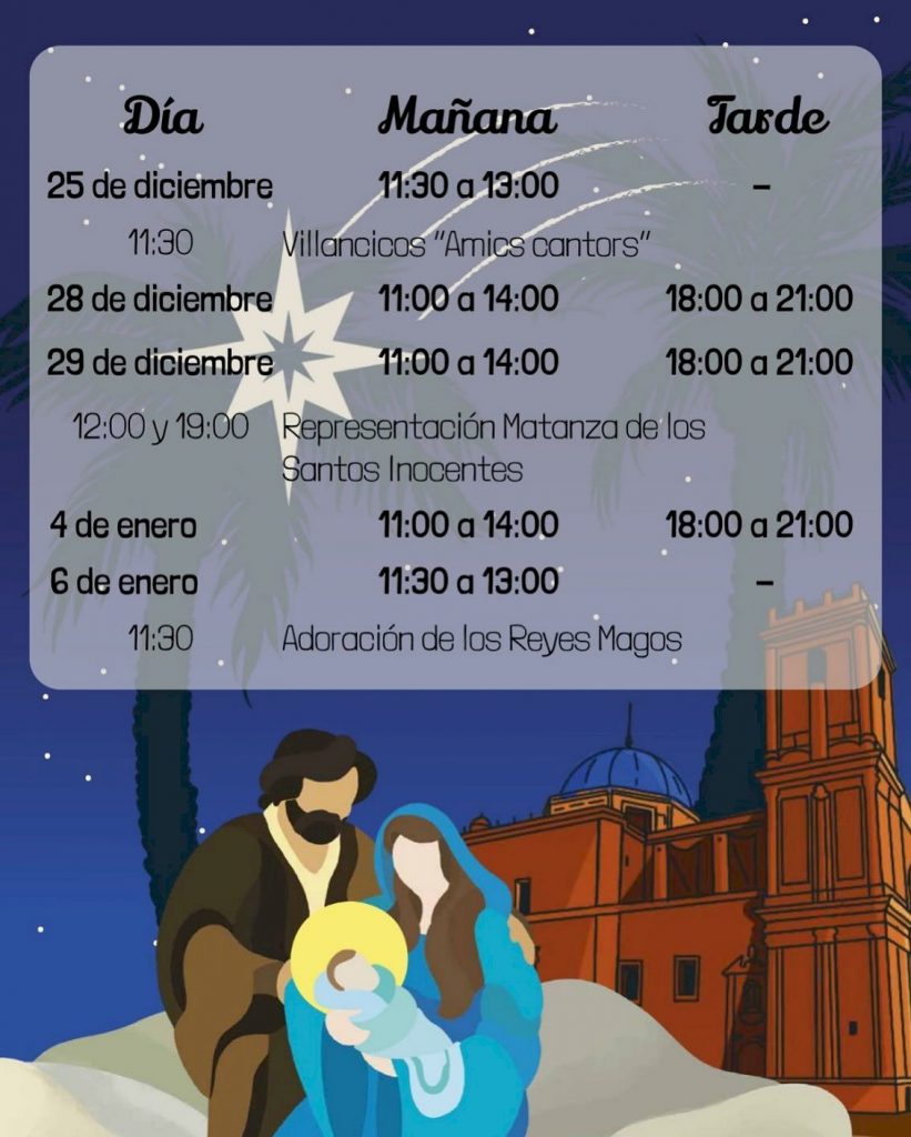 El Belén Viviente estará abierto al público el 25 de diciembre de 11.30 a 13.00 horas con la representación de villancicos ‘Amics cantaors’. Además, el 28 y 29 de diciembre permanecerá abierto en horario de mañana de 11.00 a 14.00 horas y en horario de tarde de 18.00 a 21.00 horas. Ambos días se representará la ‘Matanza de los Santos Inocentes’ en dos pases, a las 12.00 y a las 19.00. Además, el día 4 de enero también será posible visitarlo de 11.00 a 14.00 y de 18.00 a 21.00 así como el 6 de enero tan solo en horario de mañana de 11.30 a 13.00 horas con la tradicional adoración de los Reyes Magos.