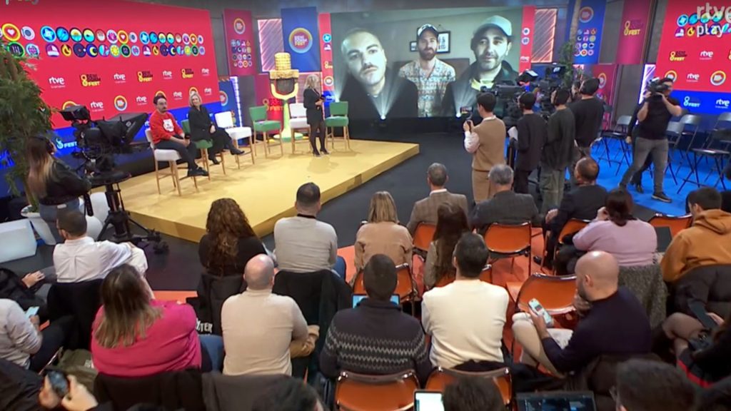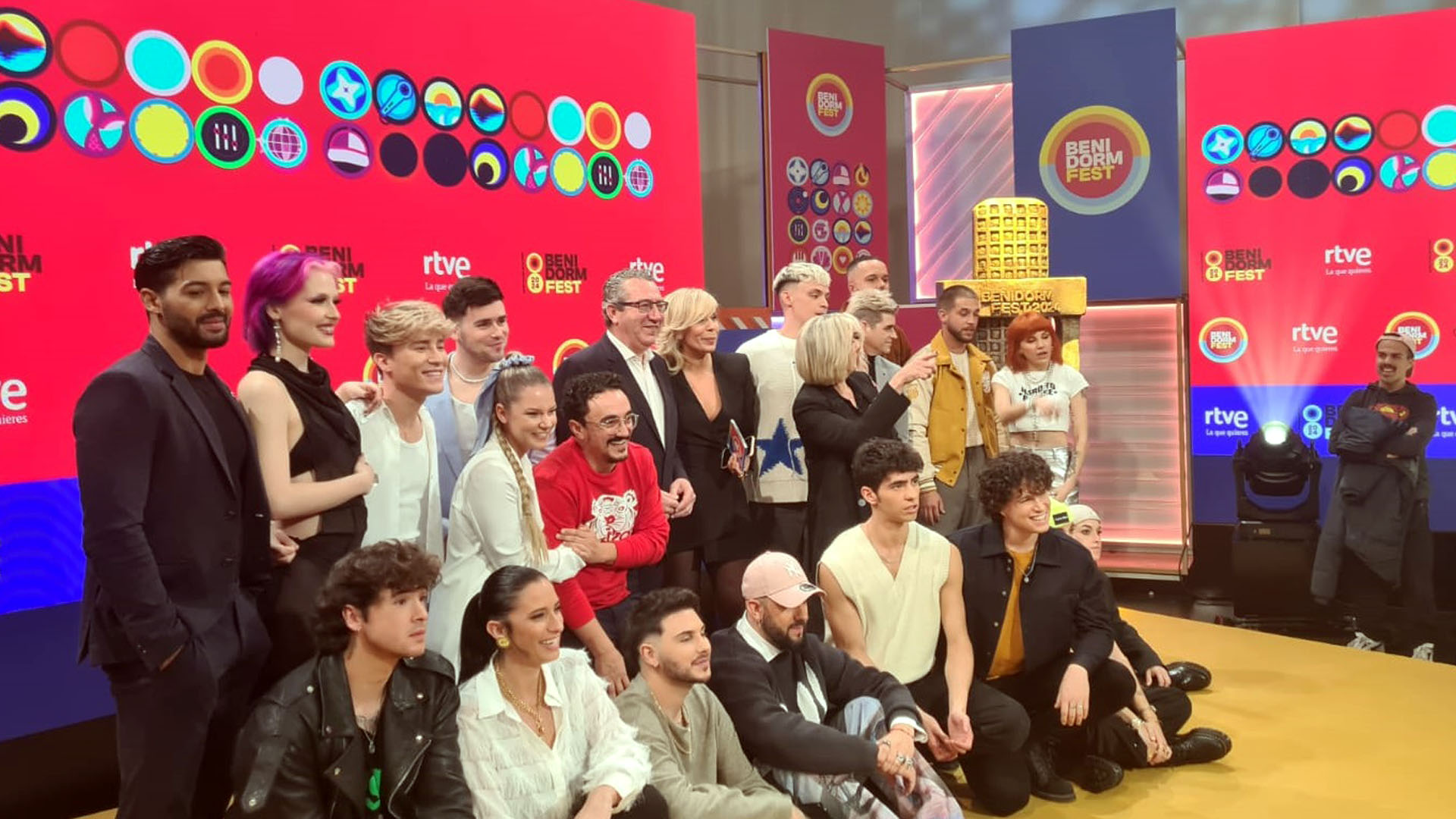 El alcalde de Benidorm, Toni Pérez, y concejal de Eventos, Jesús Carrobles, han participado este jueves en Madrid en el acto de presentación de las 16 canciones que participarán en la tercera edición del Benidorm Fest para alzarse con el Micrófono de Bronce y poder representar a España en el festival de Eurovisión. La rueda de prensa en la que se han dado a conocer los temas, dirigida por la directora de Participación y Comunicación de Radio Televisión Española (RTVE), María Eizaguirre, ha contado con la participación de casi todos los artistas seleccionados para esta edición, a excepción de dos que se encuentran fuera de España por compromisos profesionales, así como también con los codirectores del Benidorm Fest, Ana María Bordas y César Vallejo, y se ha retransmitido en directo a través de RTVE Play.