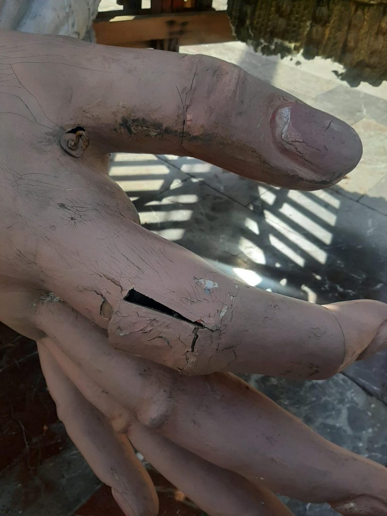 El periódico Levante EMV ha hablado con el responsable, donde denuncia, que la parte escultórica «la Virgen, el niño y la azucena muestran evidentes síntomas de ese deterioro«. Y hace referencia que se necesita una nueva estructura.