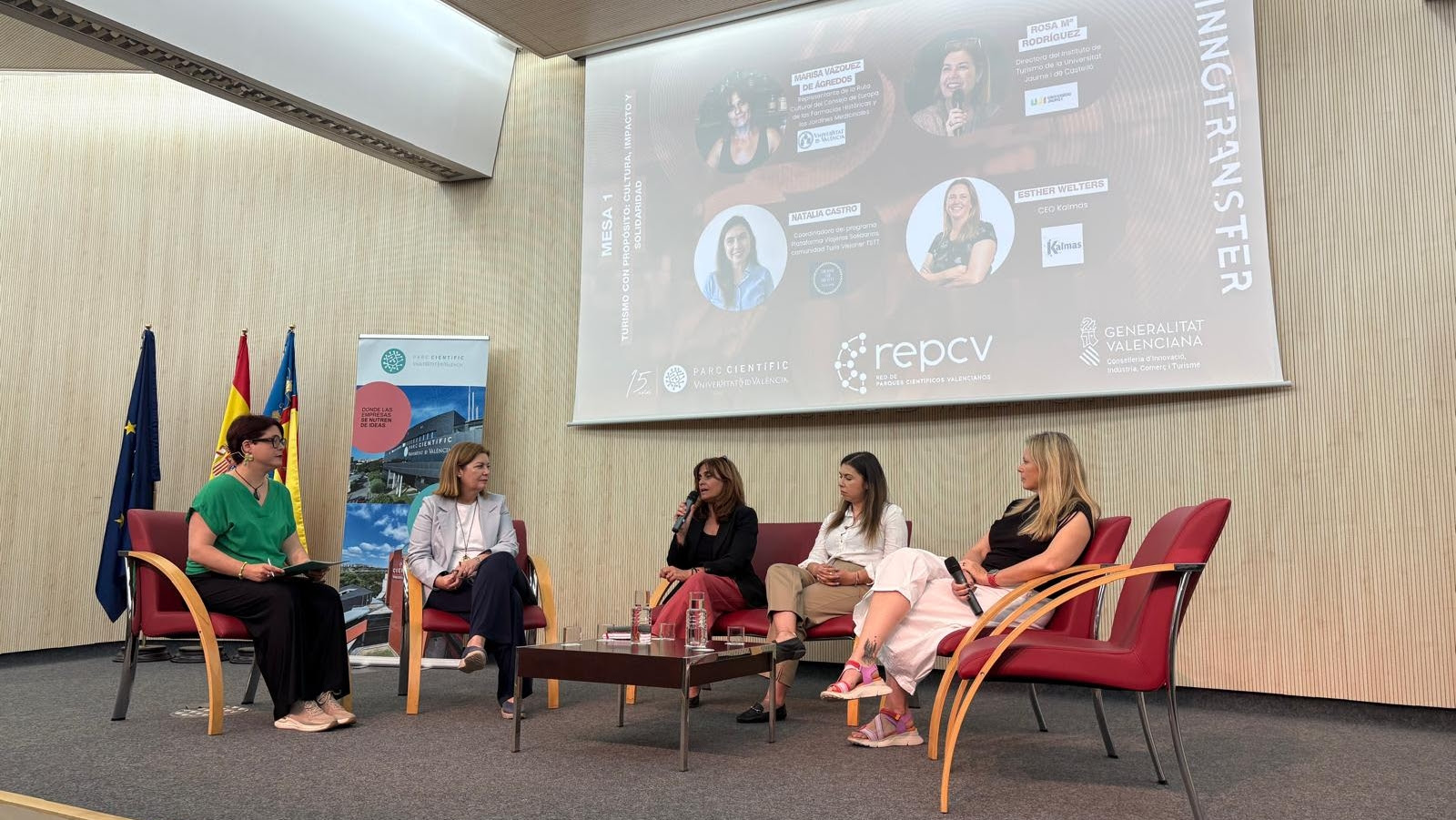 La primera mesa redonda, celebrada entre las 10:45 y las 11:30, abordó el tema “Turismo con propósito: cultura, impacto y solidaridad”. Intervinieron Marisa Vázquez de Ágredos, representante de la Ruta Cultural del Consejo de Europa de las Farmacias Históricas y los Jardines Medicinales; Rosa Mª Rodríguez Artola, directora del Instituto de Turismo de la Universitat Jaume I; Natalia Castro, coordinadora del programa Plataforma Viajeros Solidarios desde Colombia; y Esther Welters, CEO de la empresa Kalmas. Todas coincidieron en que el turismo del futuro debe promover un impacto positivo en los territorios, así como valores de cooperación y justicia social.