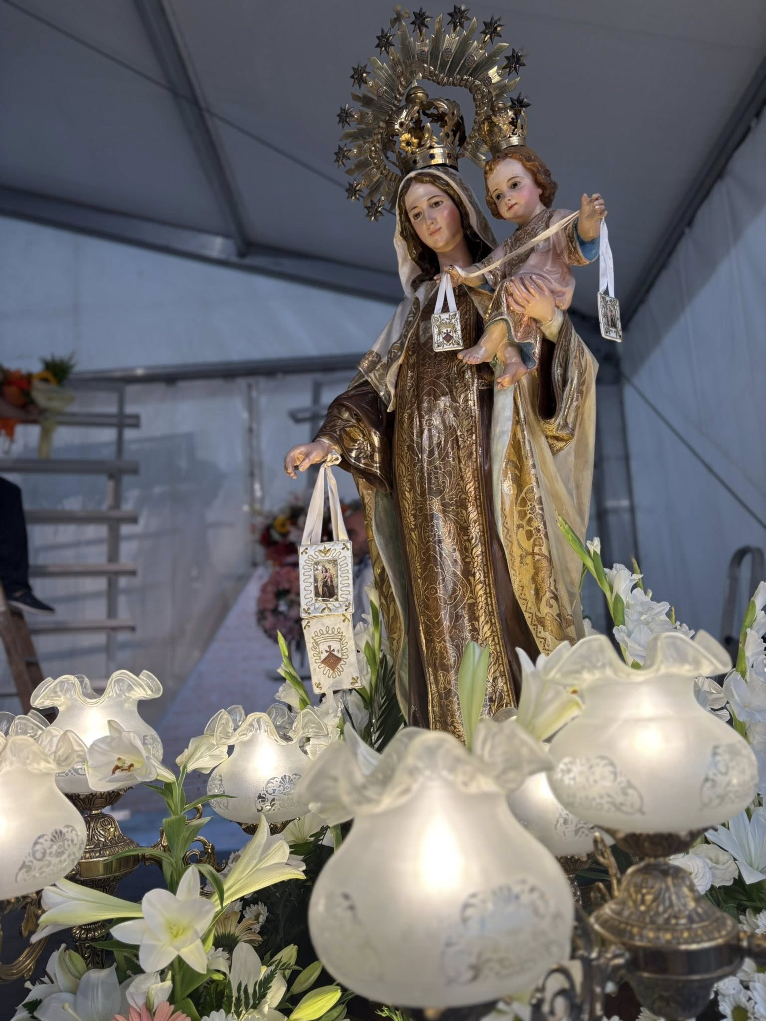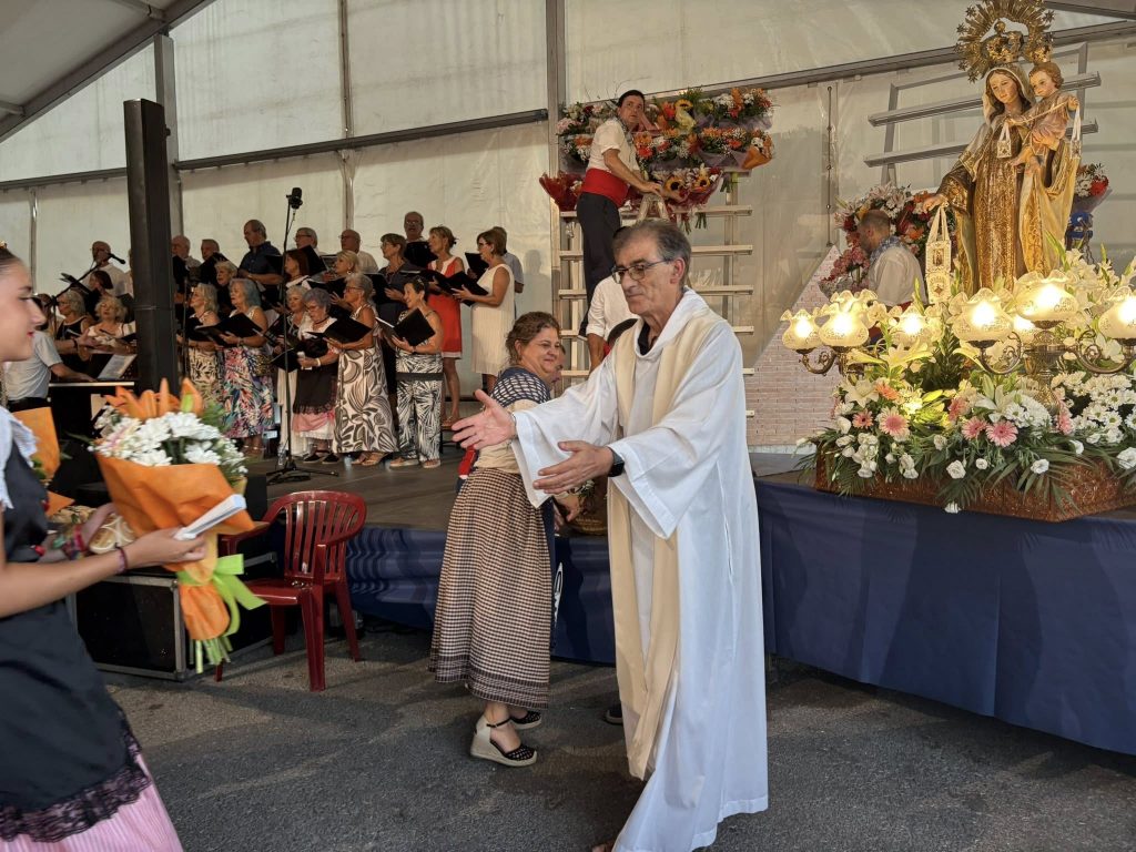 Hombres, mujeres, niños y mayores… Mucha gente en la ofrenda, que partió desde le Ermita de la Virgen del Carmen y recorrió la avenida del Carrer la Mar, el paseo marítimo, las calles Pizarro y Alcalde hasta llegar al puerto, donde se entregaban los ramos para completar el tablero dispuesto en la carpa que acoge la Virgen estos días, y donde la Coral Alborada de la Asociación de Mayores entonó, cómo no, la Salve Marinera.