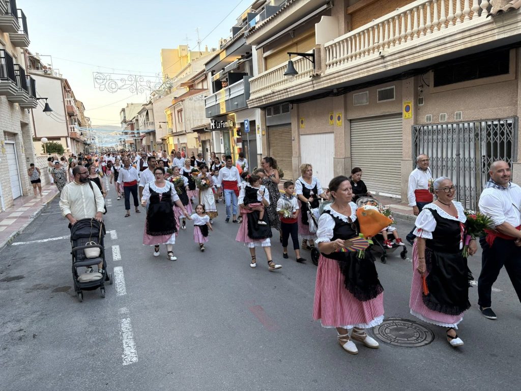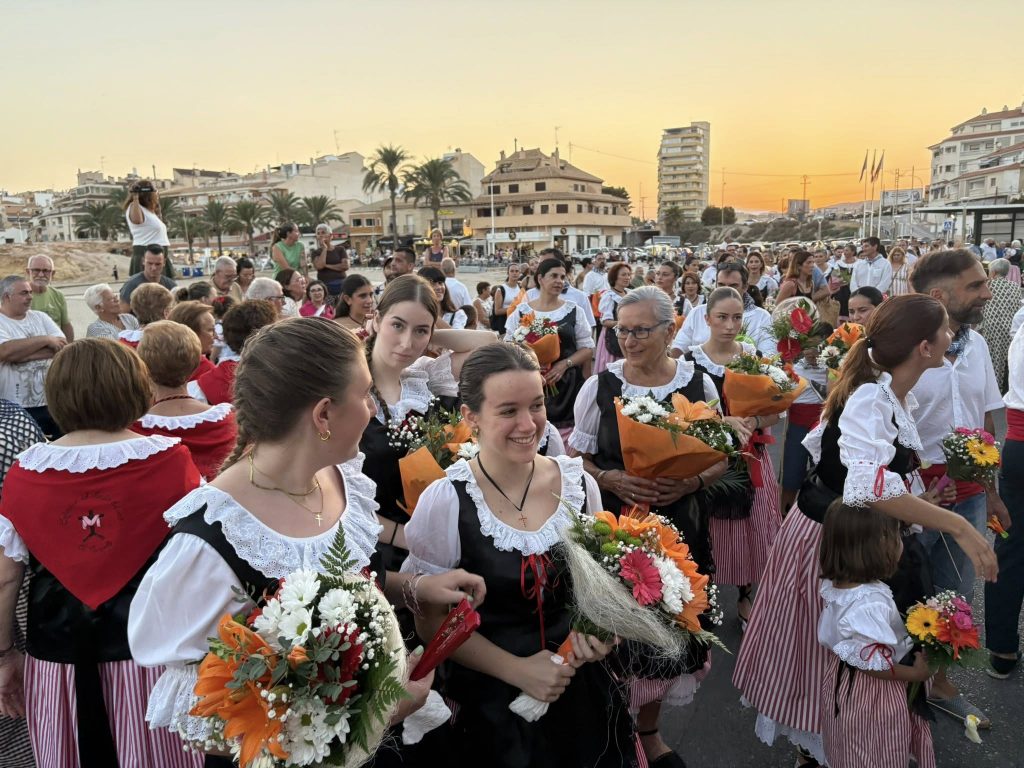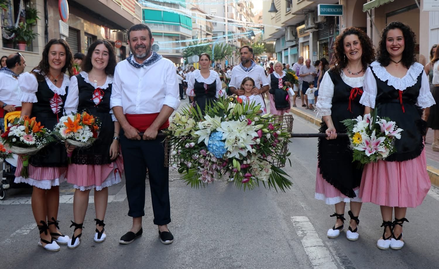 Los integrantes de la Colla Larraix de xirimitas y tabals por delante, y la banda de música L’Avanç cerrando el desfile. Entre medias, cientos de personas ataviadas con trajes regionales y bien provistas de ramos de flores o construcciones florales que llamaban la atención. Colectivos cívicos, devotos, integrantes de la Cofradía de Pescadores y autoridades locales, encabezadas por el alcalde Juanjo Berenguer y la concejala de Fiestas y Tradiciones, Marisa Navarro, acompañados por ediles del PP, PSPV-PSOE, Vox, Compromís y Per El Campello.