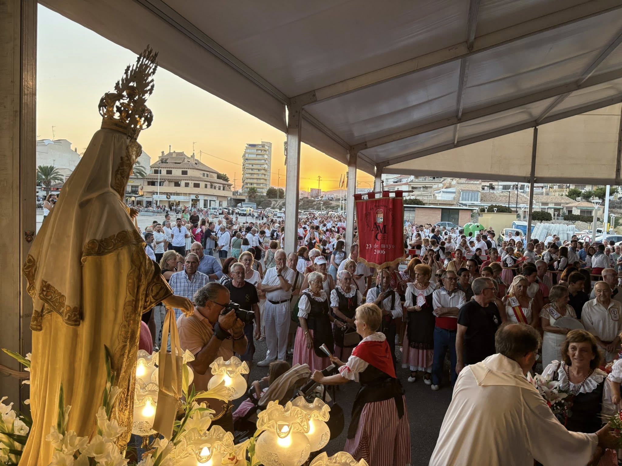 El Campello respondió ayer a la llamada para participar en la ofrenda floral. Fue un acto repleto de fervor y emociones que superó con mucho la participación de otros años, sin duda motivada por la salida a la calle de la centenaria talla original, que llevaba 47 años sin procesionar.