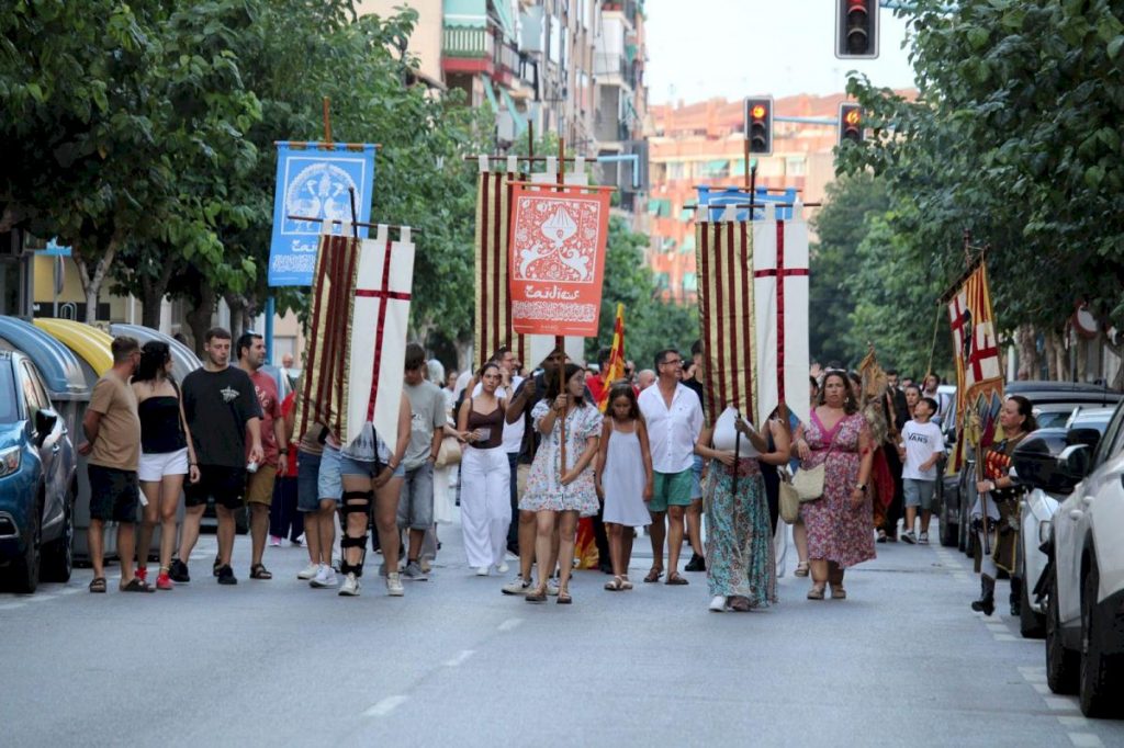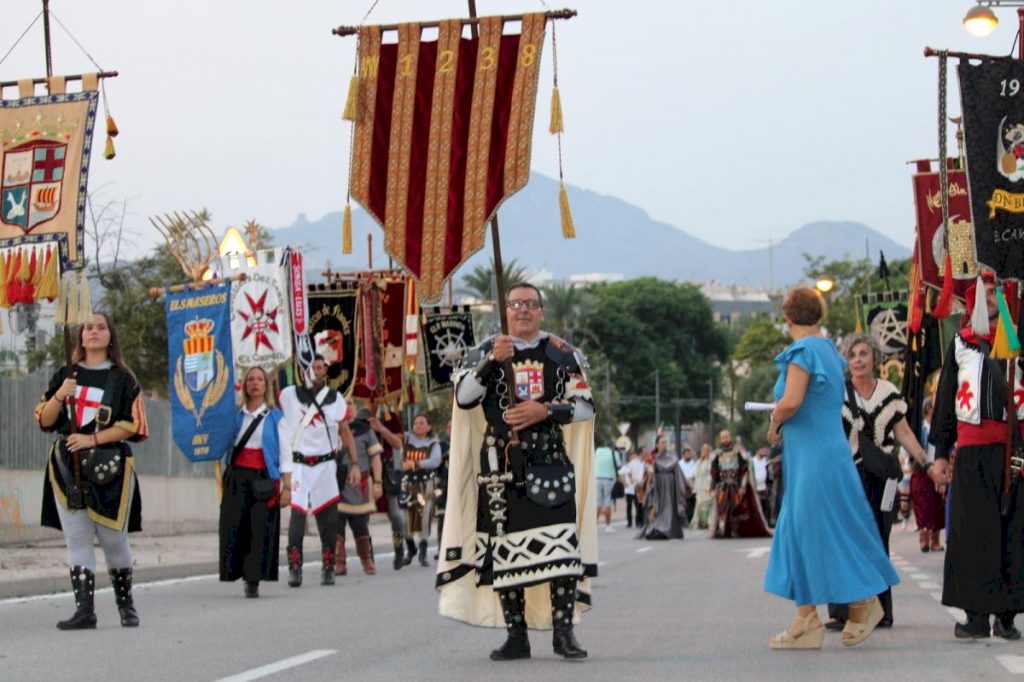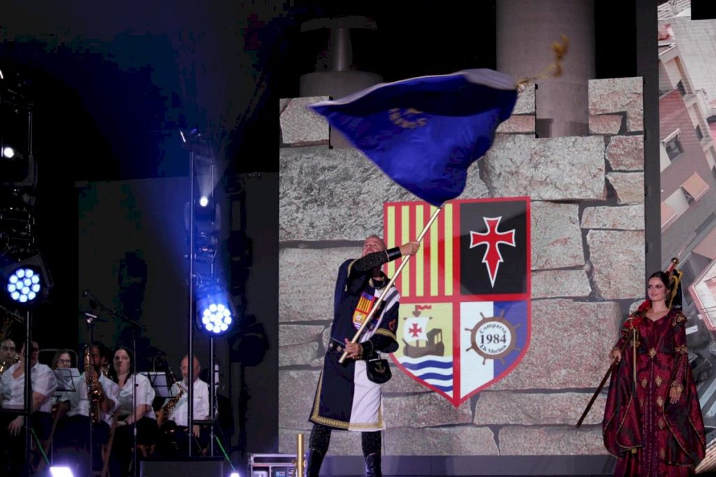 Antes de la entrada en acción de los cargos, destacó el desfile de entandartes y banderas de todas las comparsas que integran las fiestas, cerrando con la llegada del pendón de conquista de Jaume I, al son de la Muixeranga.