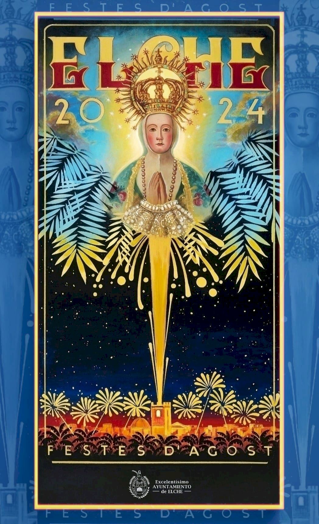El cartel, con la Virgen de la Asunción como protagonista, al igual que la tradicional Nit de l’Albà, “se ha realizado de forma totalmente manual, sin artificios, en óleo y en acrílico y en el que se puede observar la ciudad de Elche y la noche iluminada con su gran palmera de la Virgen” ha explicado el autor, Francisco Rovira que ha recordado que cuando presentó el cartel de Semana Santa 2021, “me quedé asombrado ante el oratorio que tenéis dedicado a vuestra patrona, quedé maravillado ante tanta belleza y esa imagen quedó grabada en mi retina hasta hoy día. Por eso la obra de Villanueva del siglo XVII es el principal motivo del cartel”.