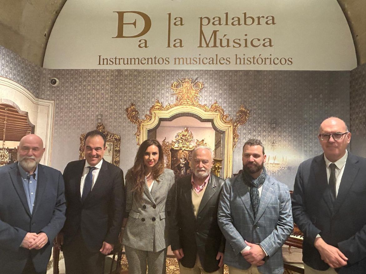 La exposición “De la palabra a la música. Instrumentos musicales históricos en Alicante” la han inaugurado este viernes en la Sala Taberna los concejales de Turismo y Cultura, Ana Poquet y Antonio Peral, a quienes ha acompañado el vicealcalde, Manuel Villar, junto al jefe de Patrimonio Integral Municipal y coordinador de la muestra, José Manuel Pérez Burgos, y los dos comisarios, el catedrático de Música José María Vives, y el doctor y restaurador de instrumentos de Patrimonio Nacional Víctor Martínez, propietarios de las piezas expuestas.