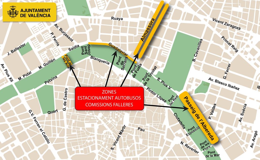 Toda la información sobre cortes de calles, ubicación de monumentos falleros y zonas de actividad puede ser consultada en el Geoportal del Ayuntamiento de València: https://geoportal.valencia.es/apps/GeoportalHome/va/inicio/ y en las redes sociales del Centro de Gestión de Tráfico, https://www.facebook.com/TransitVLC/?locale=es_ES y https://x.com/TransitValencia.