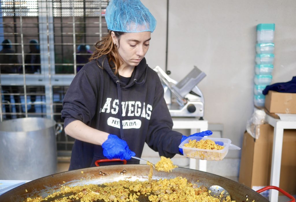 Cada día, en las instalaciones del Centro Social, que disponen de una amplia cocina- donde a lo largo del curso ofrecen programas formativos de cocina y asistencia socio-laboral a favor de personas en riesgo de exclusión social- están cocinando entre 200 y 300 raciones, también bocadillos y preparando cajas de fruta.