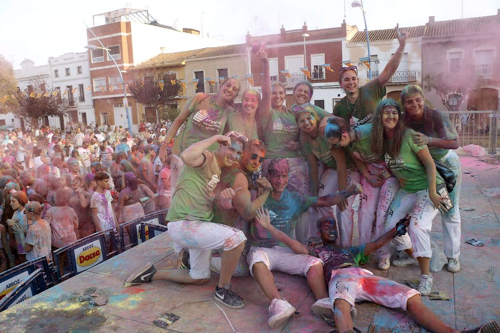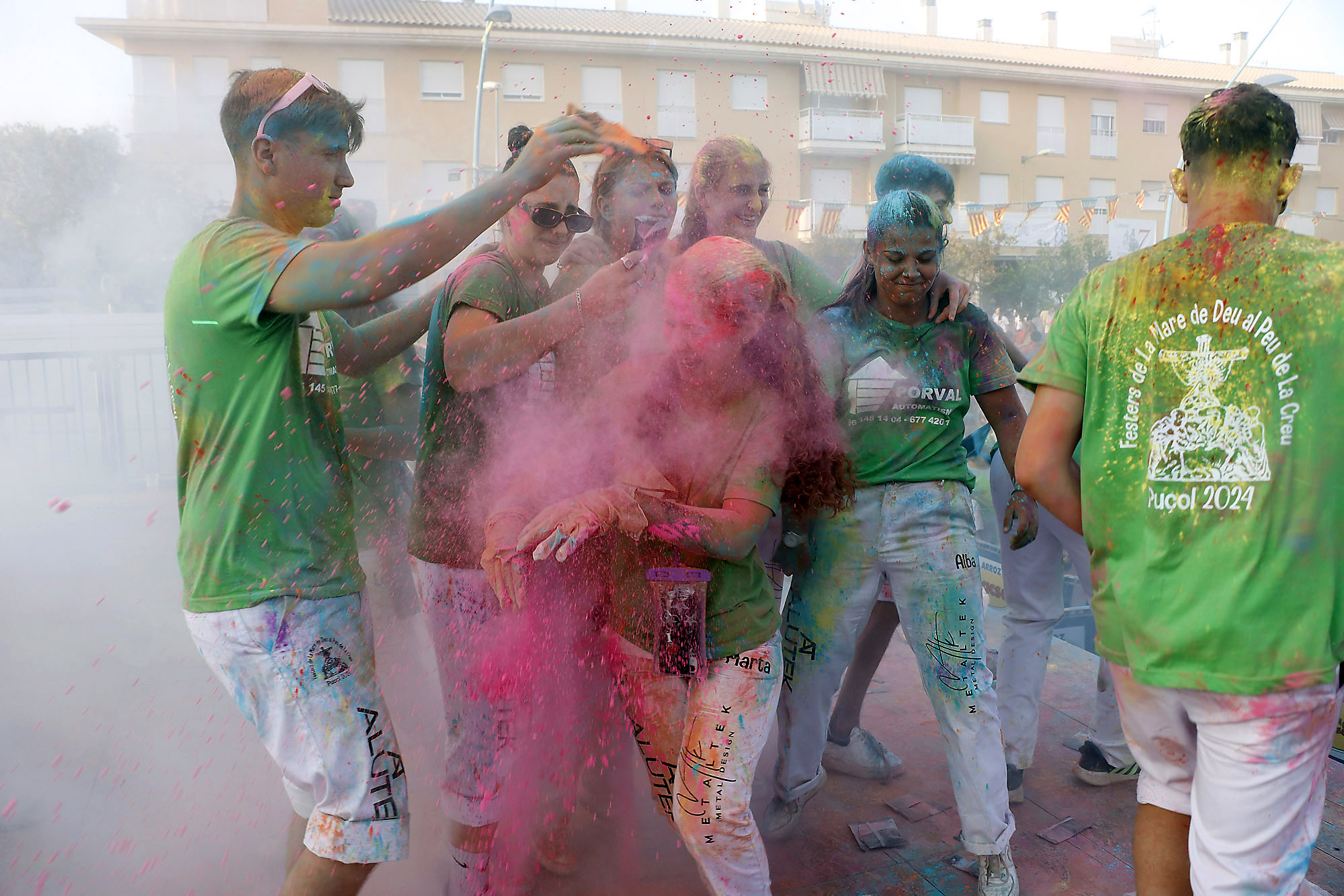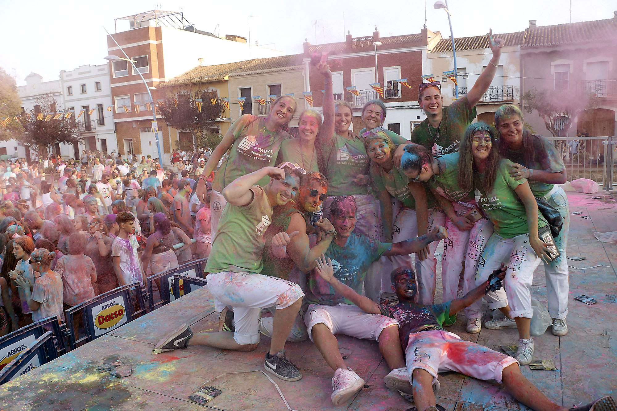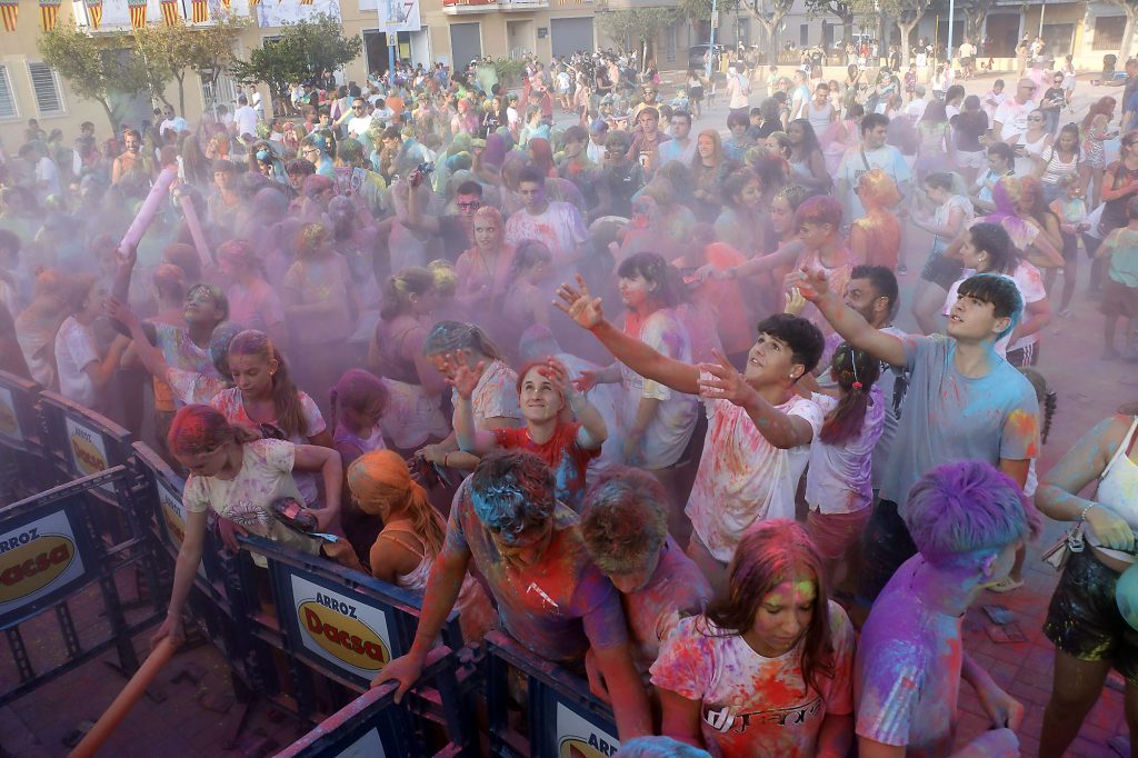 Acompañados de la charanga Los Desataos, un sonoro pasacalle llevó a los participantes a la plaza de la Comunitat Valenciana, donde los festeros, subidos en el escenario, se dedicaron a repartir bolsas de polvos de llamativos colores, que pronto se extendieron por todo el escenario.