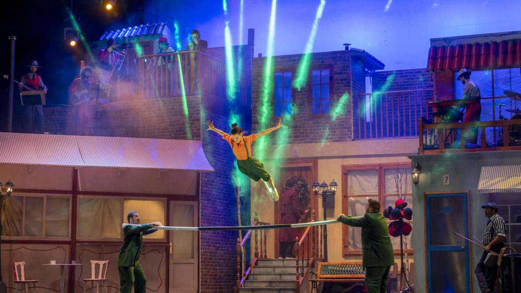 «El espectáculo -continúa- con una gran técnica circense, ofrece más de una decena de números trepidantes en sesenta minutos que se desarrollan dentro y fuera del escenario, algunos de ellos grupales con figuras y acrobacias en el aire que sorprenderán a toda la familia». El espectáculo de circo multidisciplinar, de gran complejidad y formato, ilusionará a las familias con números como la rueda Cyr, el trapecio volante, el columpio ruso, malabares con mazas, el diábolo, manipulación de escobas, banquinas y portes acrobáticos, cuerdas aéreas, la barra rusa y la cama elástica.