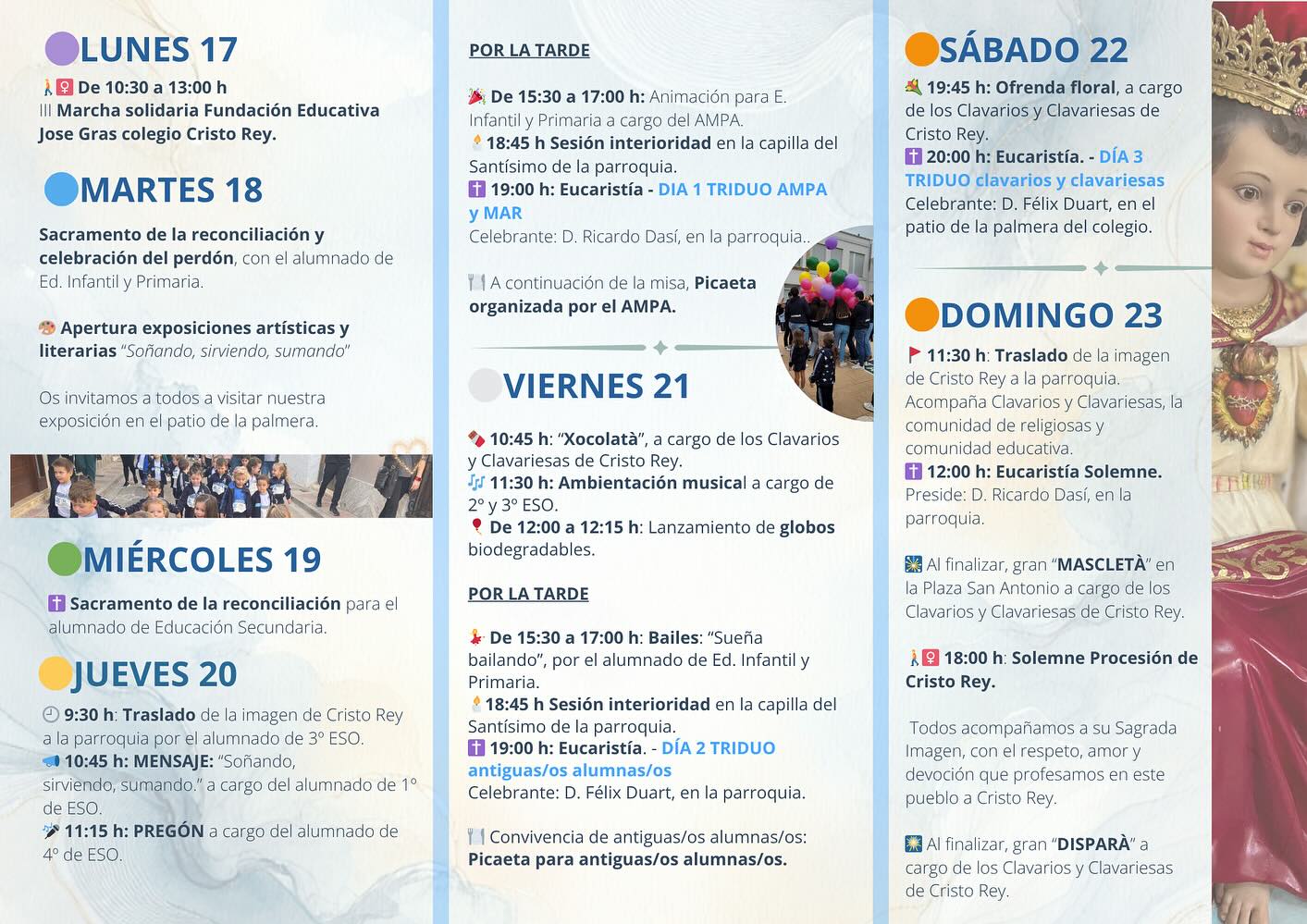 La comunidad de Hijas del Colegio Cristo Rey, profesores, alumnos, ex alumnos, padres y un gran número de vecinos se unirán de nuevo para participar en los actos programados para celebrar como cada año por estas fechas esta fiesta en honor a Cristo Rey.