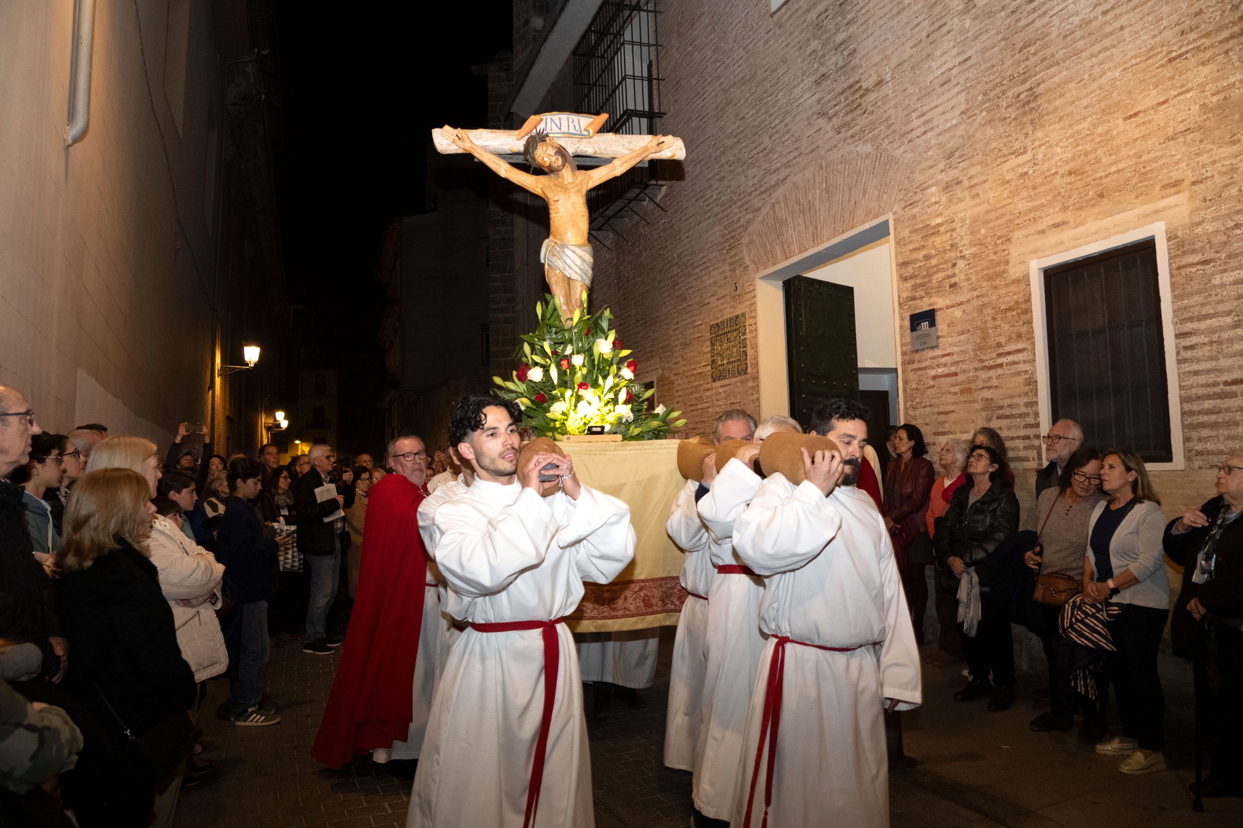La imagen del Cristo de las Penas ha recorrido este Jueves Santo las calles de Ciutat Vella junto a las tallas procesionales más antiguas de la Semana Santa valenciana, las de la Virgen María y San Juan Evangelista del siglo XII, que se veneran en la iglesia de San Juan del Hospital de Valencia.