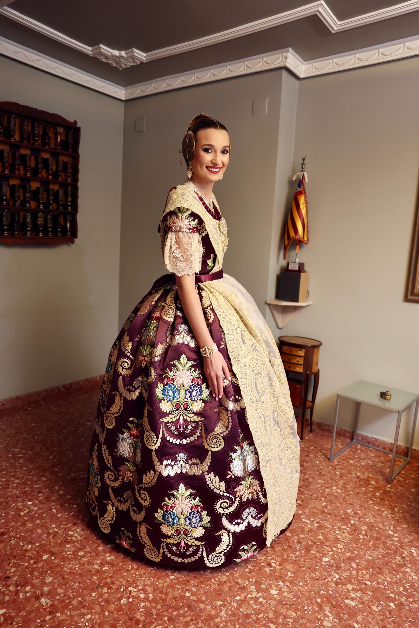 Cerca de las 20:00 horas de la tarde, Berta, radiante e ilusionada, ha salido de su casa entre los miles de aplausos de todos los allí congregados y, por fin, hemos podido conocer el secreto mejor guardado, el color de su espolín: melanzane, tejido por Vives y Marí y confeccionado por A l’Antiga de Torrent.