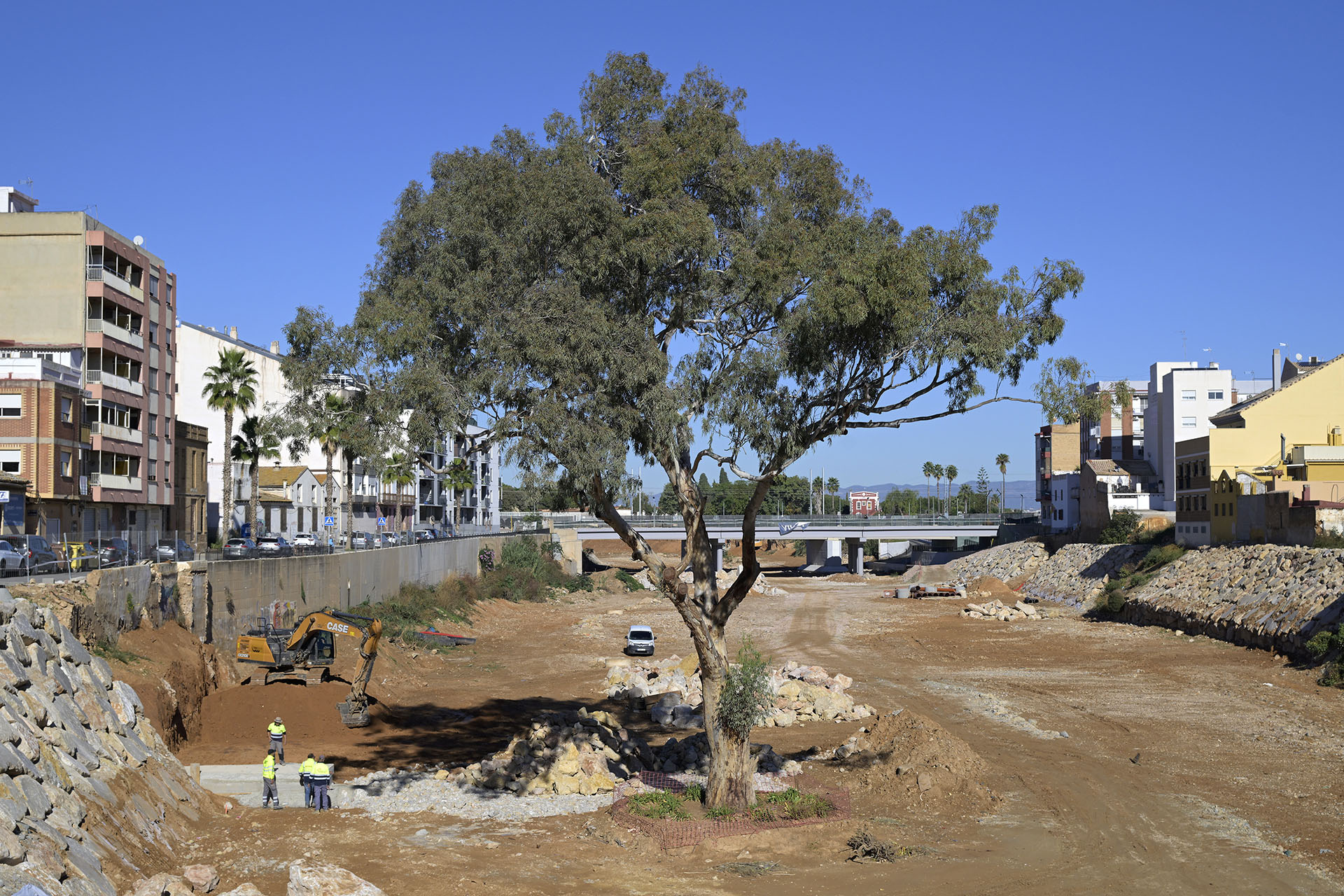 Situado en el cauce del Barranco del Poyo, este Eucalyptus camaldulensis centenario forma parte del Catálogo de Árboles Monumentales y Singulares de la Comunitat Valenciana. A lo largo de su vida ha resistido diversos episodios de inundación, incluida la riada que afectó a Paiporta en octubre de 2024. Sus raíces profundas, que pueden alcanzar hasta 35 metros, han contribuido tanto a su estabilidad como a la del terreno que lo rodea.