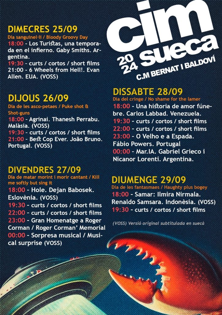 Com cada any, l’il·lustre Festival de Cine de Merda (CIM) de Sueca torna junt a la costera de setembre per a fer la tornada a la feina més miserable, si escau. Del 25 al 29 de setembre, el C.M. Bernat i Baldoví (pretèrit Cine Lido) esdevé l’hipocentre d’un seísme de despropòsits audiovisuals per desgràcia o fortuna de tota la Ribera Baixa. En aquesta nova edició, es presentaran més de 100 pelis, de les quals  hi ha un total de 10 llargmetratges -per a plorar de pura vergonya aliena- a competició. Òbviament, el certamen continua fent un merescut lloc a la sèrie B, el trash, el gore, l’amateur, l’underground i a totes aquelles cintes que també mereixen el seu espai a les pantalles de cinema, almenys, una vegada en la seua vida. Es pot consultar la programació completa a la web del festival: www.cimsueca.com.