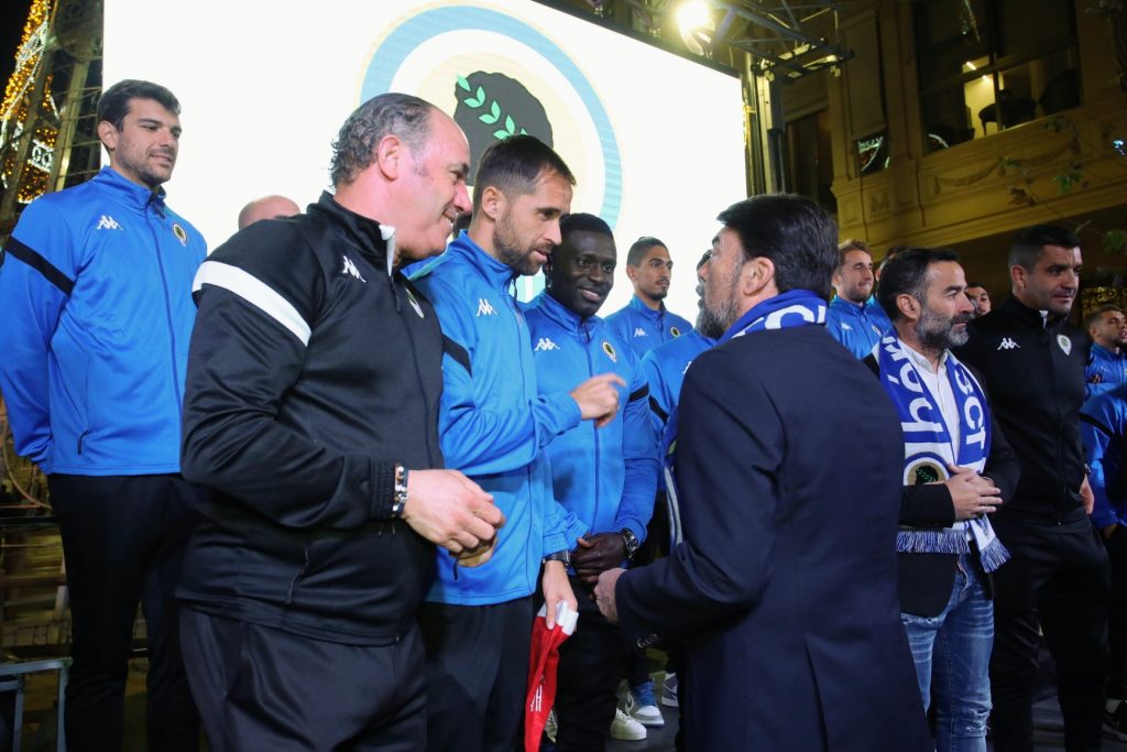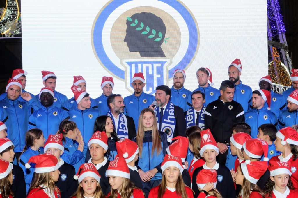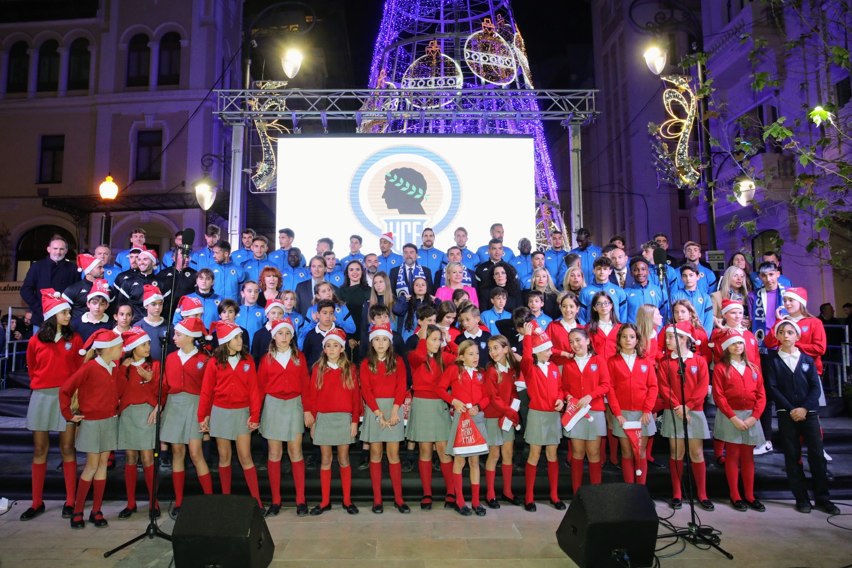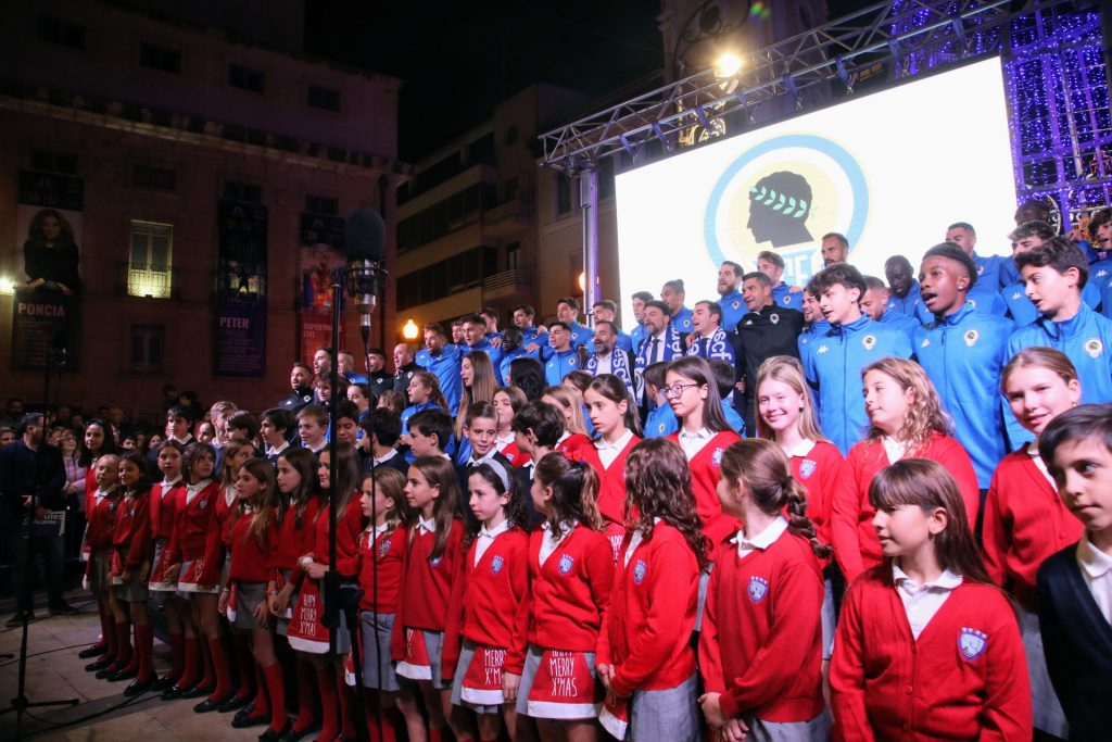 El Hércules Club de Fútbol ha llenado este lunes de sabor navideño la avenida de la Constitución con la interpretación del villancico popular ‘Navidad en Paz’, adaptando su letra a Alicante y a la entidad blanquiazul. El alcalde Luis Barcala y el concejal de Deportes, Toni Gallego, se han sumado a la iniciativa. Integrantes de la Corporación se han sumado, seguidamente, a cantarlo en una repetición de la pieza navideña. Como ha explicado el primer edil “esta idea pretende acercar al Hércules a la ciudad y, además, compartir la ilusión que están generando los resultados del equipo en esta temporada”. El presidente Carlos Parodi ha destacado que “se ha elegido este enclave porque se ha convertido, con ese abeto gigante, en uno de los referentes más visitados de la Navidad de este año en Alicante”.