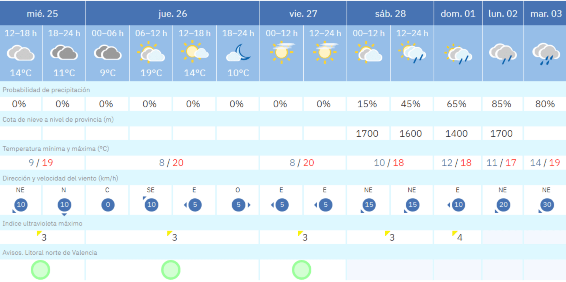 Lunes y martes son los días con más inestabilidad. El lunes 2 se espera una jornada gris con cielos completamente cubiertos y posibilidad de lluvias débiles a lo largo del día. Para la jornada del martes 3, además de las lluvias débiles, no se descartan tormentas en el interior de la provincia de Valencia. Las temperaturas se moverán entre los 17 y 19 grados de máxima.