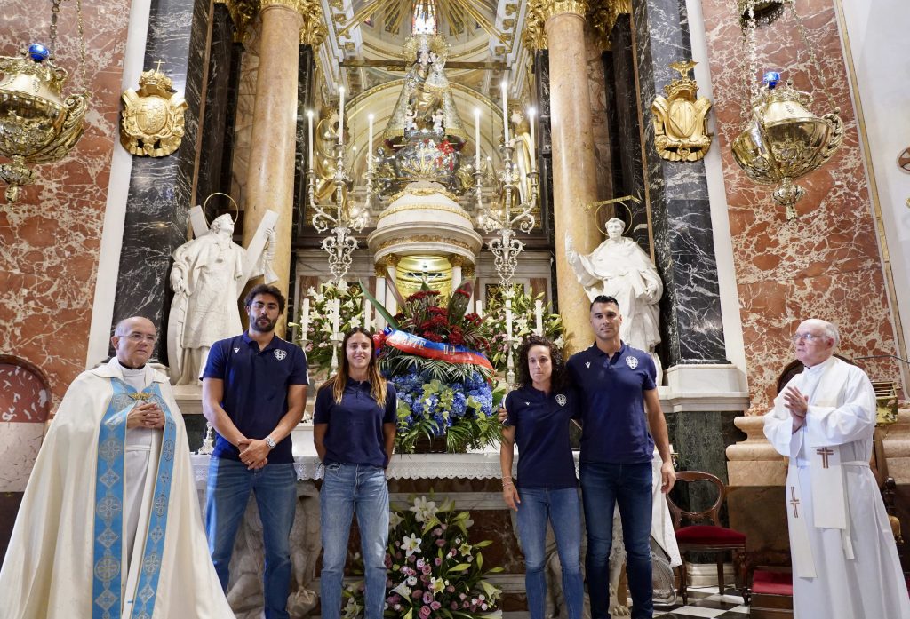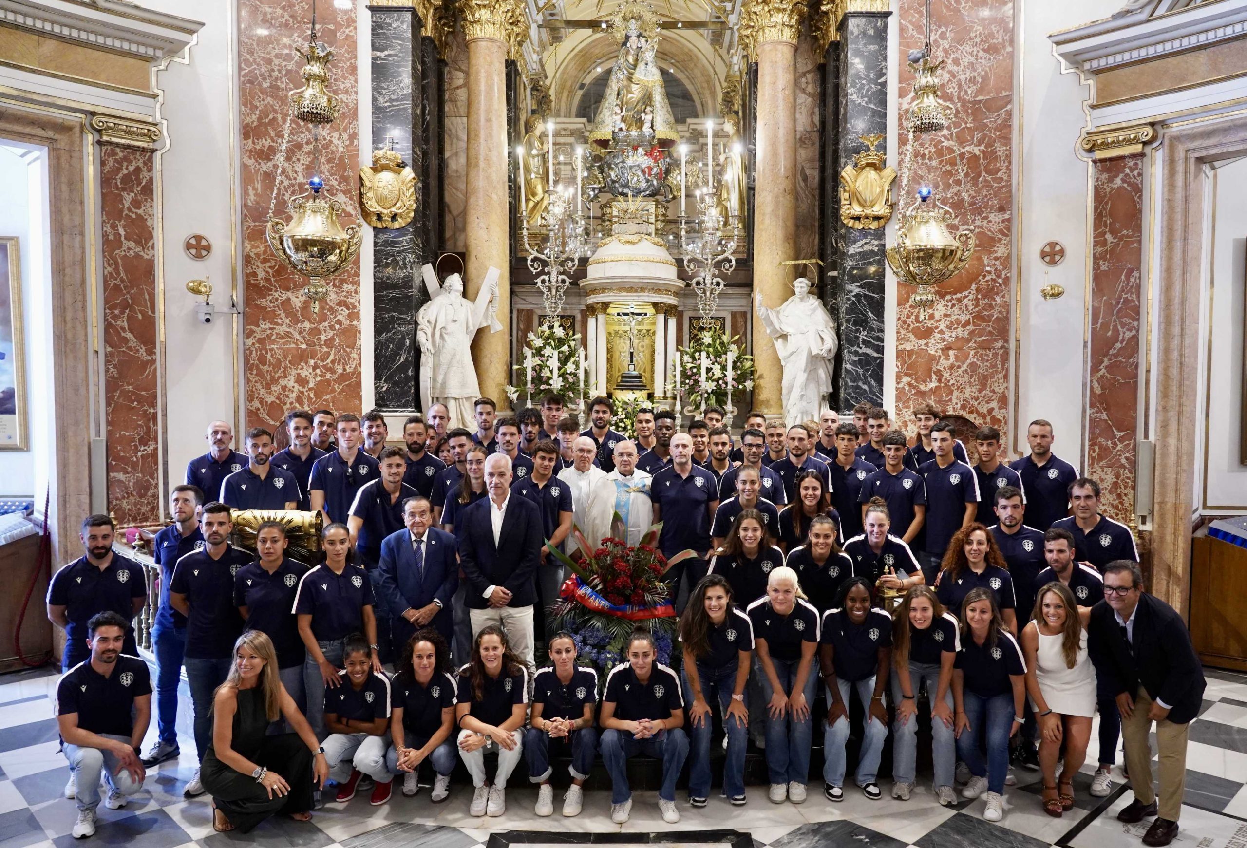 La Basílica de Nuestra Señora de los Desamparados ha recibido hoy, lunes, la visita del Levante UD que ha realizado la tradicional ofrenda floral ante la imagen de la Mare de Déu antes del inicio de la temporada de Liga.