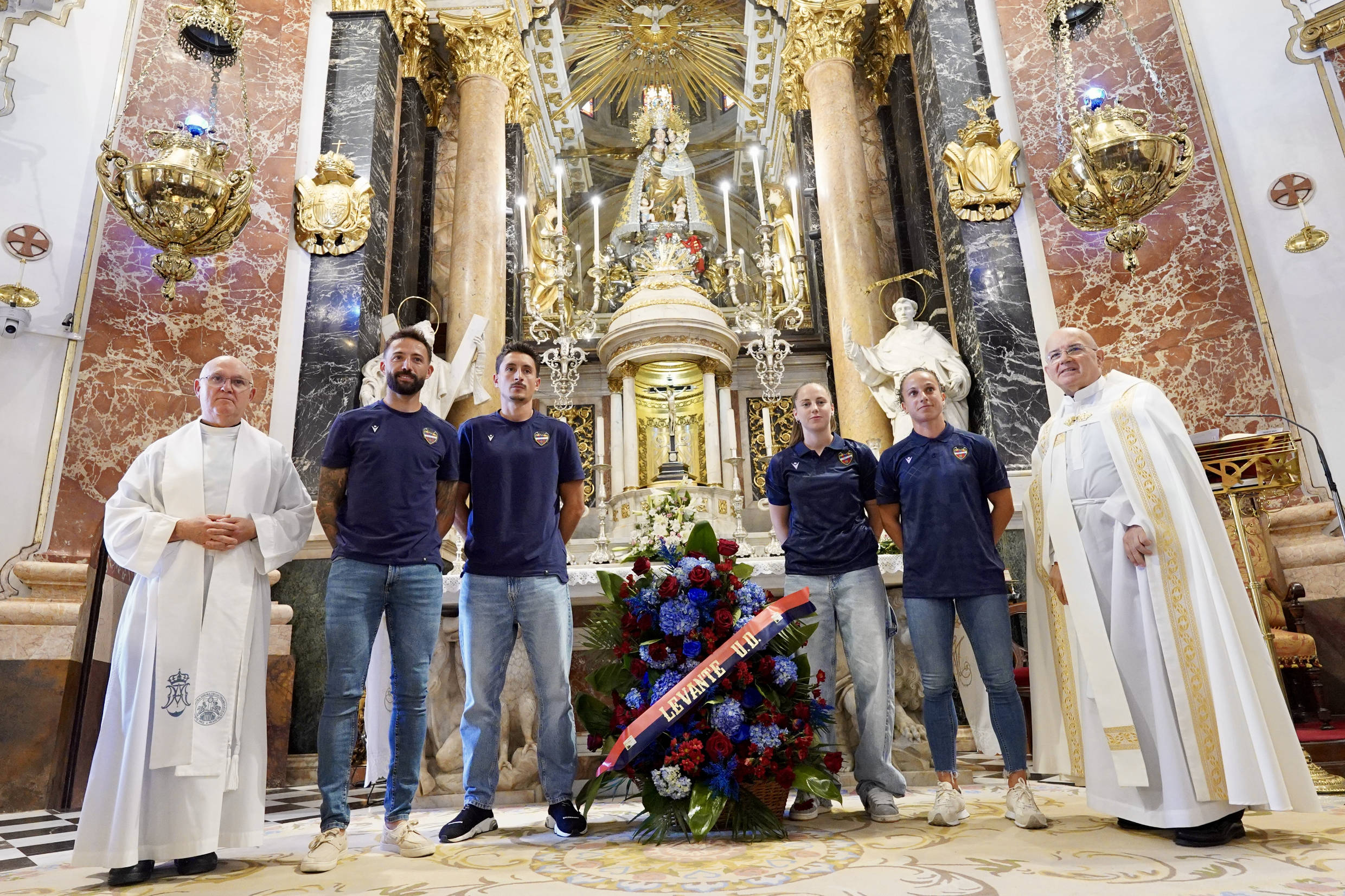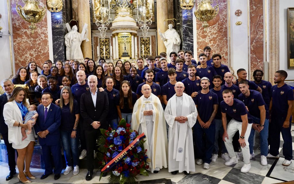 La Basílica de Nuestra Señora de los Desamparados ha recibido hoy, lunes, la visita del Levante UD que ha realizado la tradicional ofrenda floral ante la imagen de la Mare de Déu antes del inicio de la temporada de Liga.