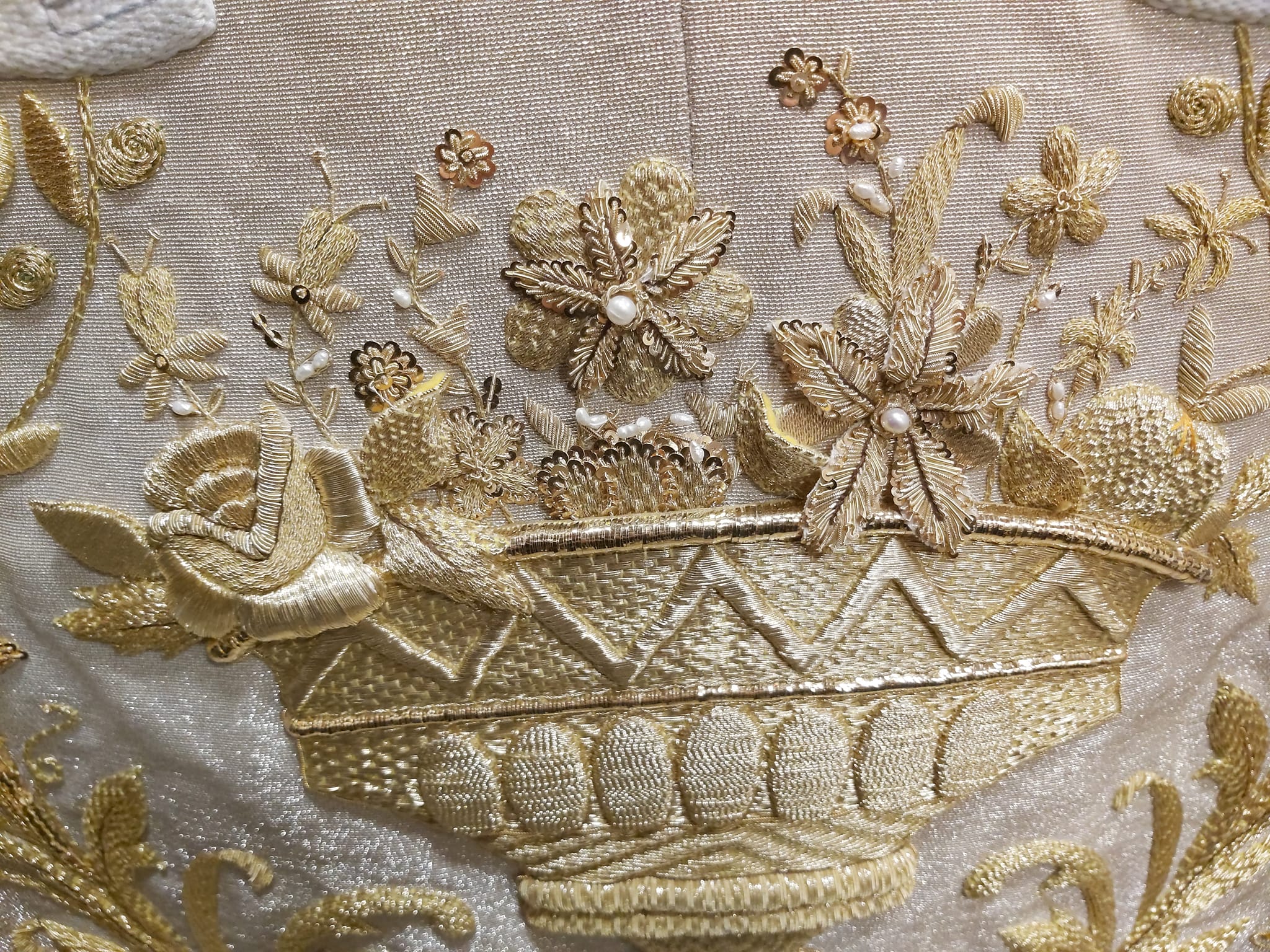 El manto, bordado en realce y cartulina, “está hecho todo a mano y lleva unas bases de cartulina o de fieltro y algodón, y por encima, el oro con puntadas de hilo amarillo. La mayoría de las piezas se bordan en bastidores pequeños y luego se aplica todo en el tisú de plata que se está tejiendo”, explica Jaime Guillem, de Bordados Angelita Suay, sobre el proceso de confección.