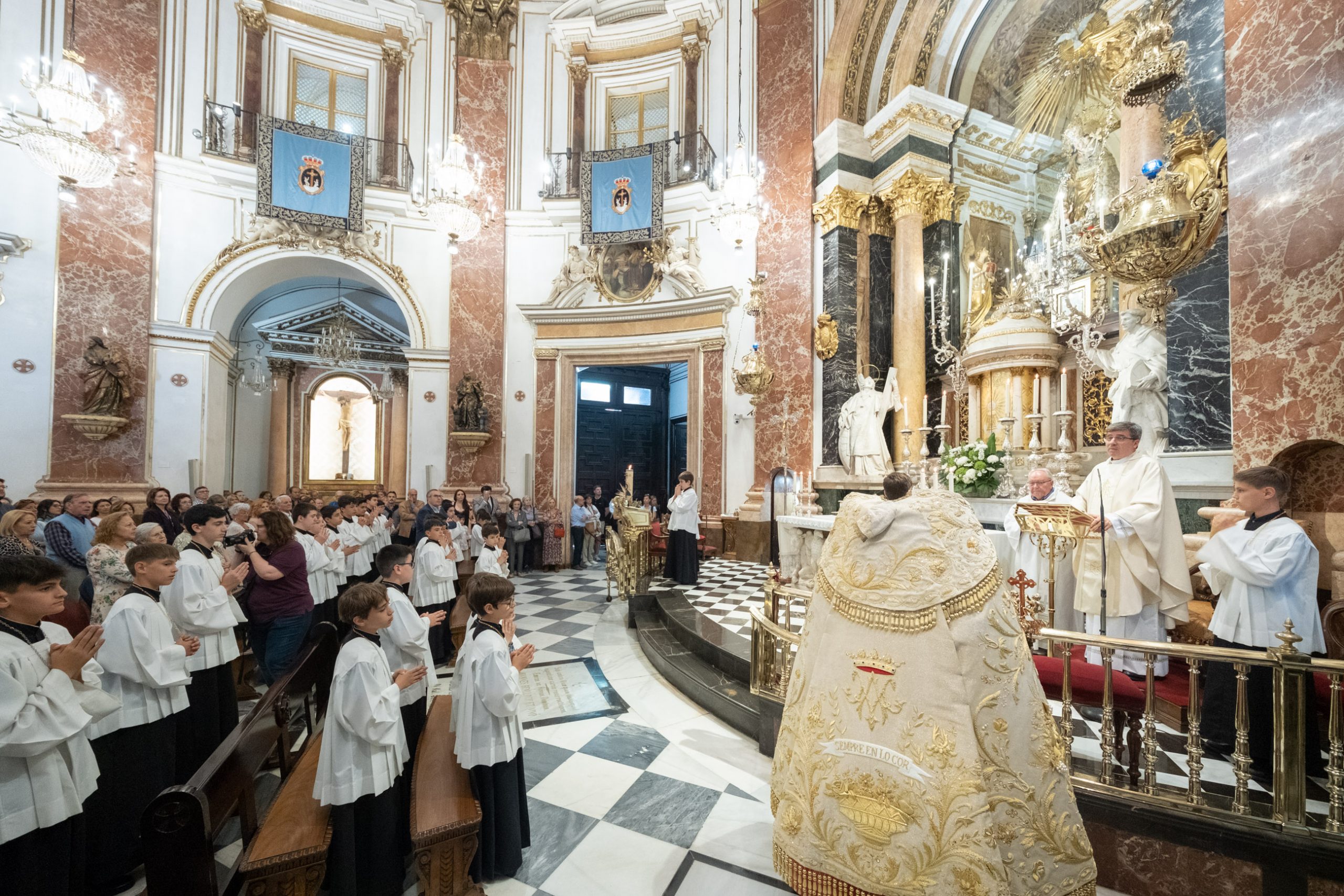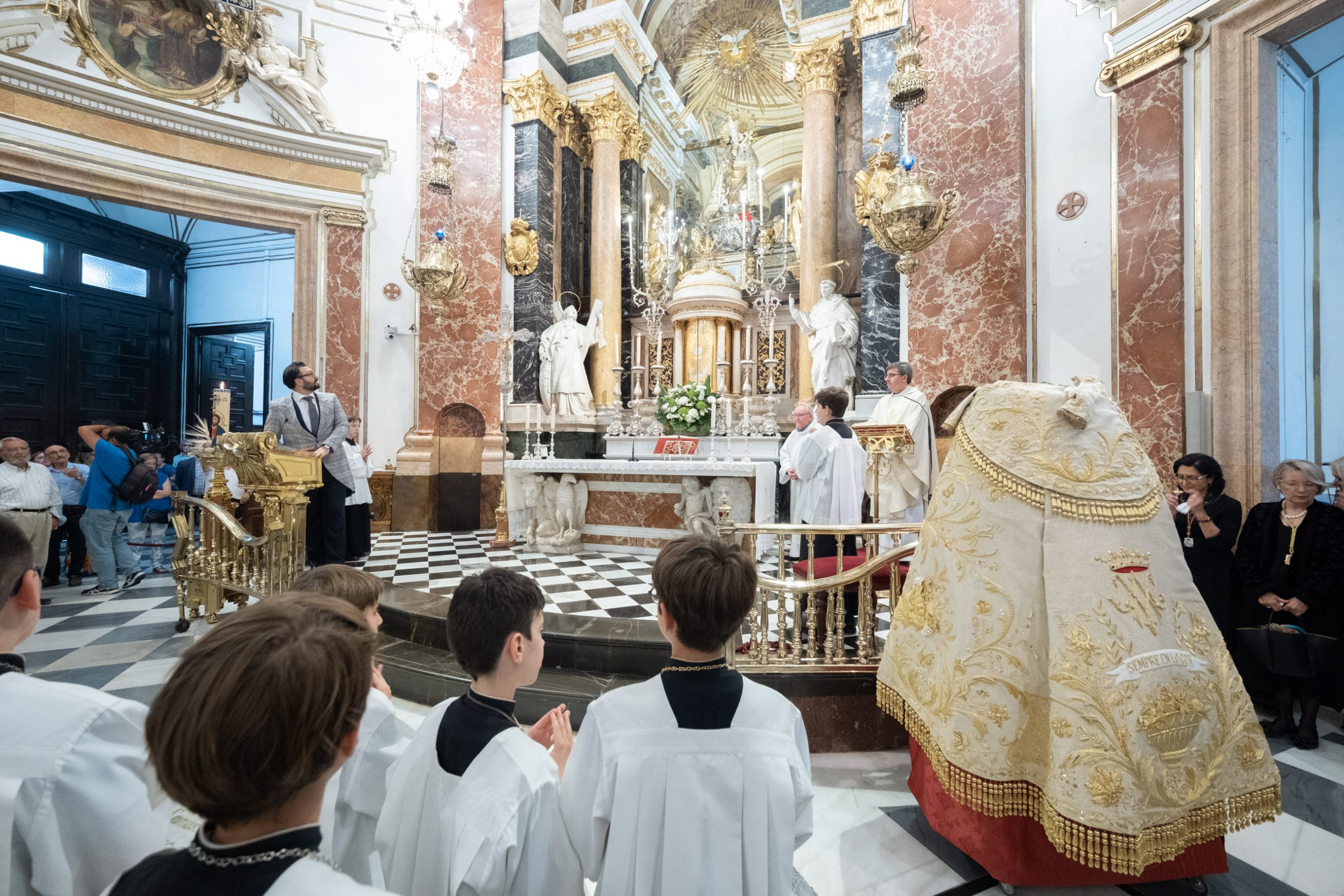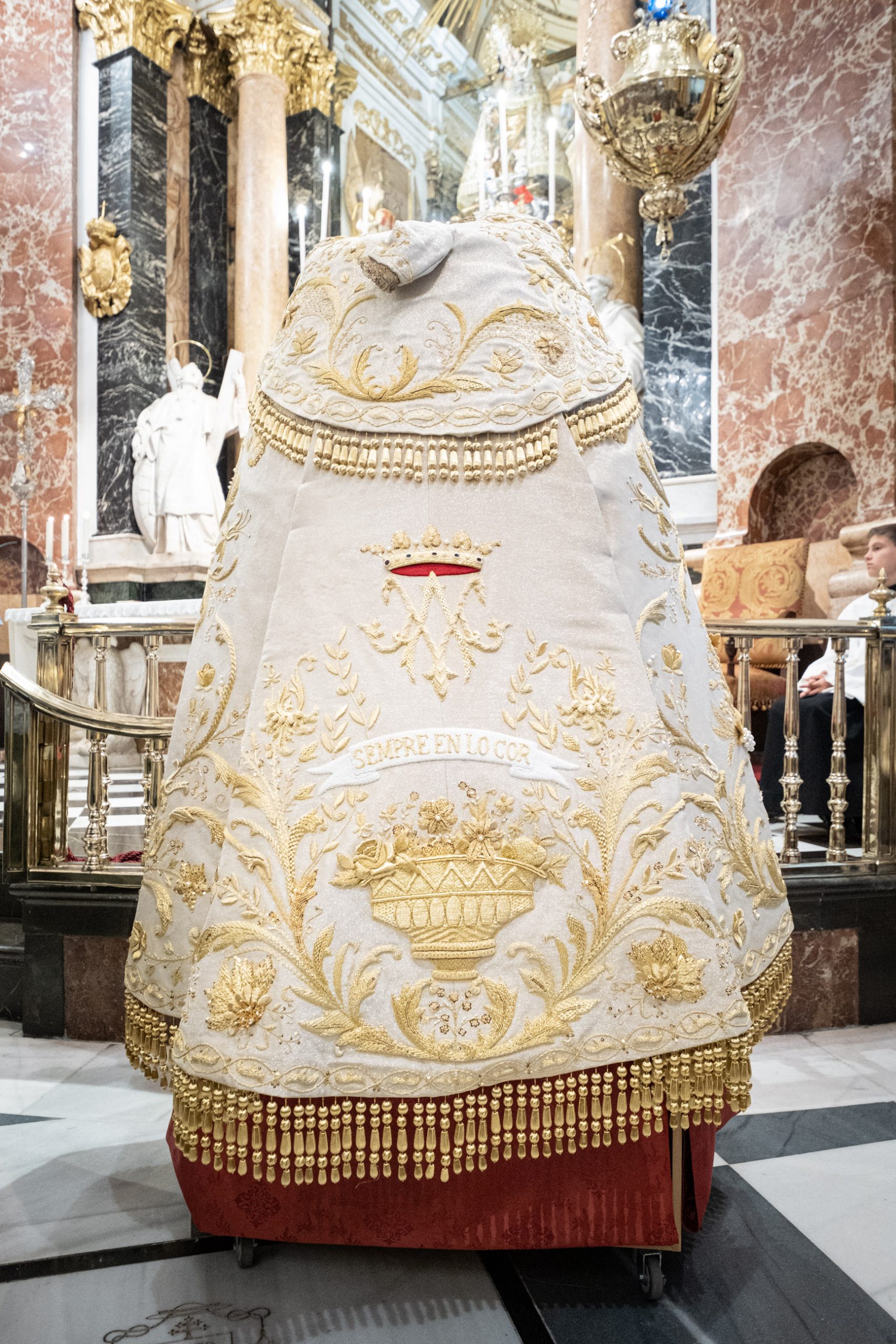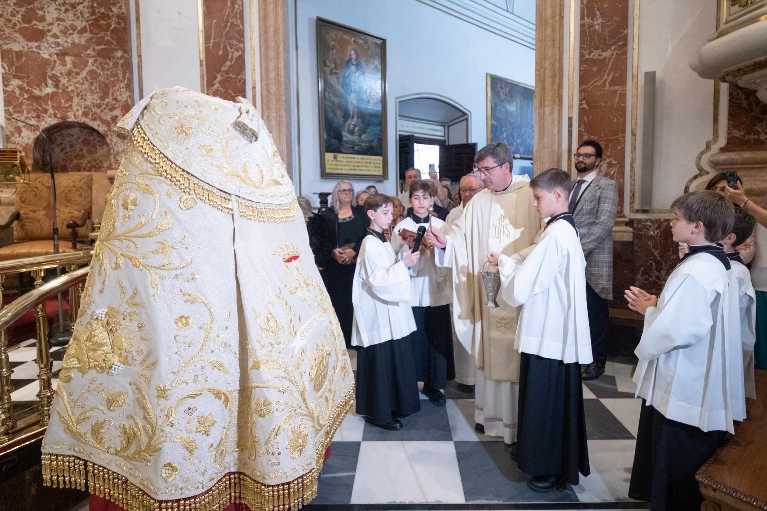 La entrega del manto y su bendición, por el rector de la Basílica, Melchor Seguí, ha tenido lugar después de la misa de las 13 horas en la Basílica, en la que han tomado parte representantes de todas las entidades implicadas en este proyecto.
